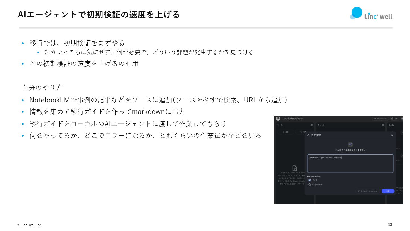 33 ©Linc' well inc. AIエージェントで初期検証の速度を上げる • 移⾏では、初期検証をまずやる • 細かいところは気にせず、何が必要で、どういう課題が発⽣するかを⾒つける •