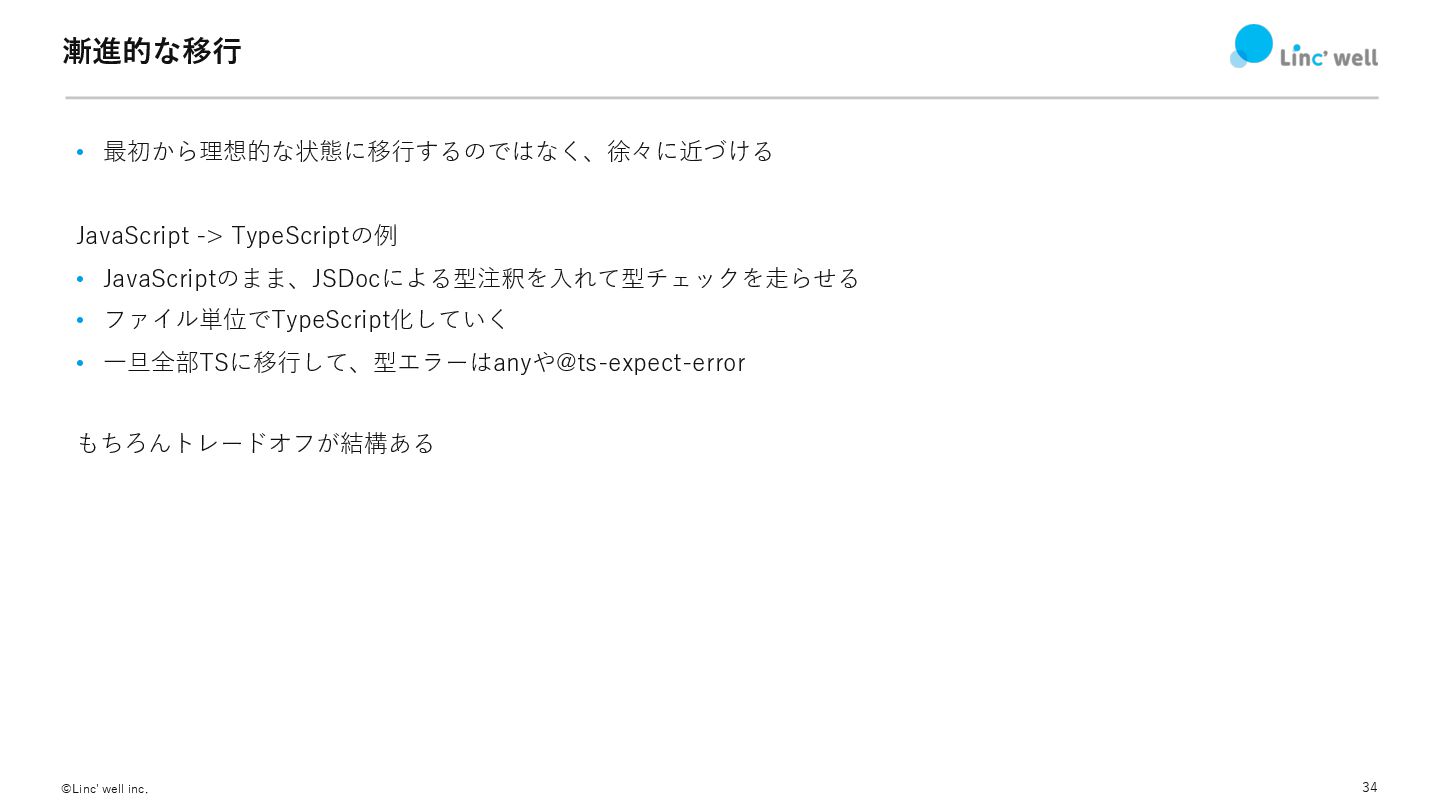 34 ©Linc' well inc. 漸進的な移⾏ • 最初から理想的な状態に移⾏するのではなく、徐々に近づける JavaScript -> TypeScriptの例