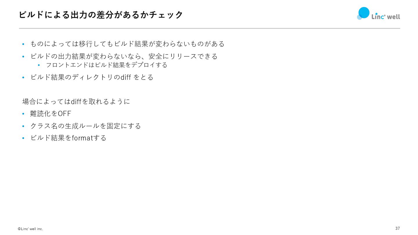 37 ©Linc' well inc. ビルドによる出⼒の差分があるかチェック • ものによっては移⾏してもビルド結果が変わらないものがある • ビルドの出⼒結果が変わらないなら、安全にリリースできる •