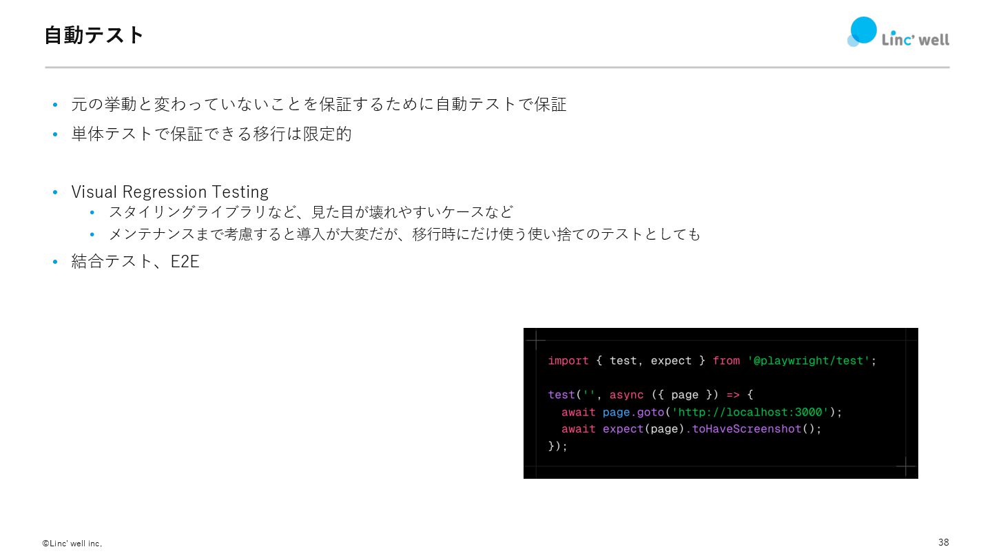 38 ©Linc' well inc. ⾃動テスト • 元の挙動と変わっていないことを保証するために⾃動テストで保証 • 単体テストで保証できる移⾏は限定的 •