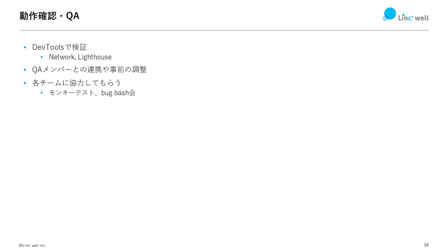 39 ©Linc' well inc. 動作確認・QA • DevToolsで検証 • Network, Lighthouse