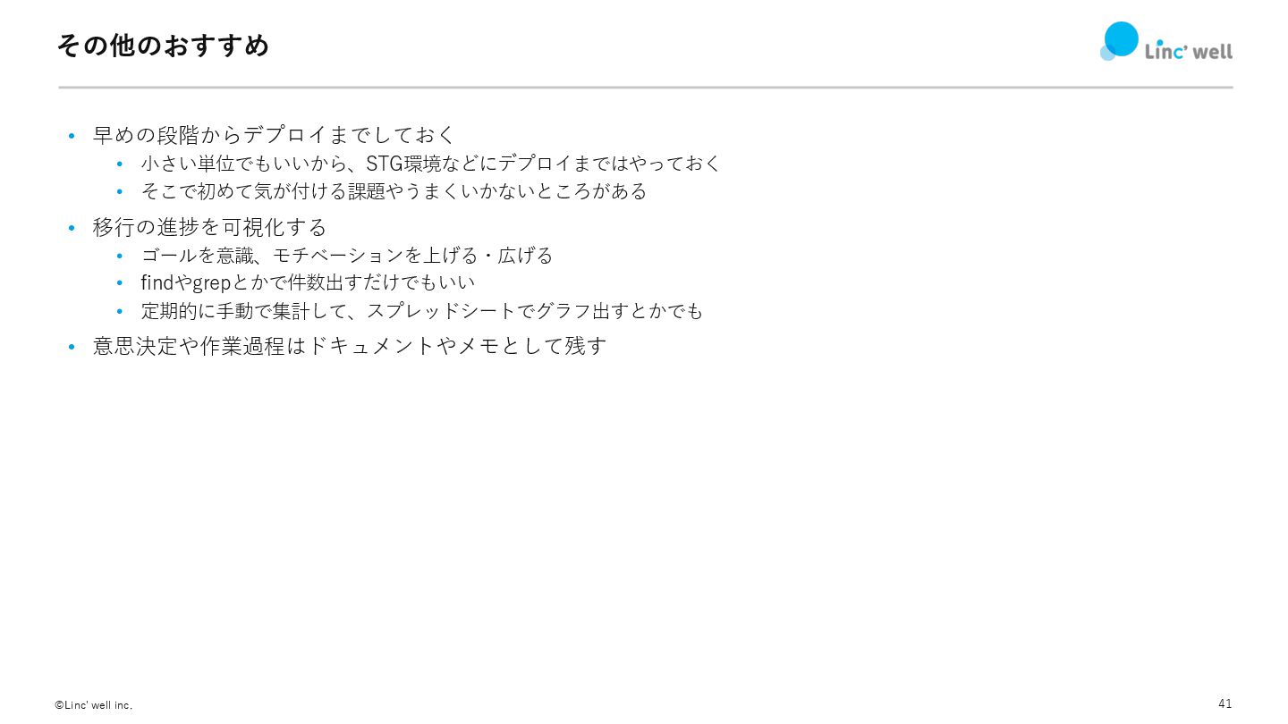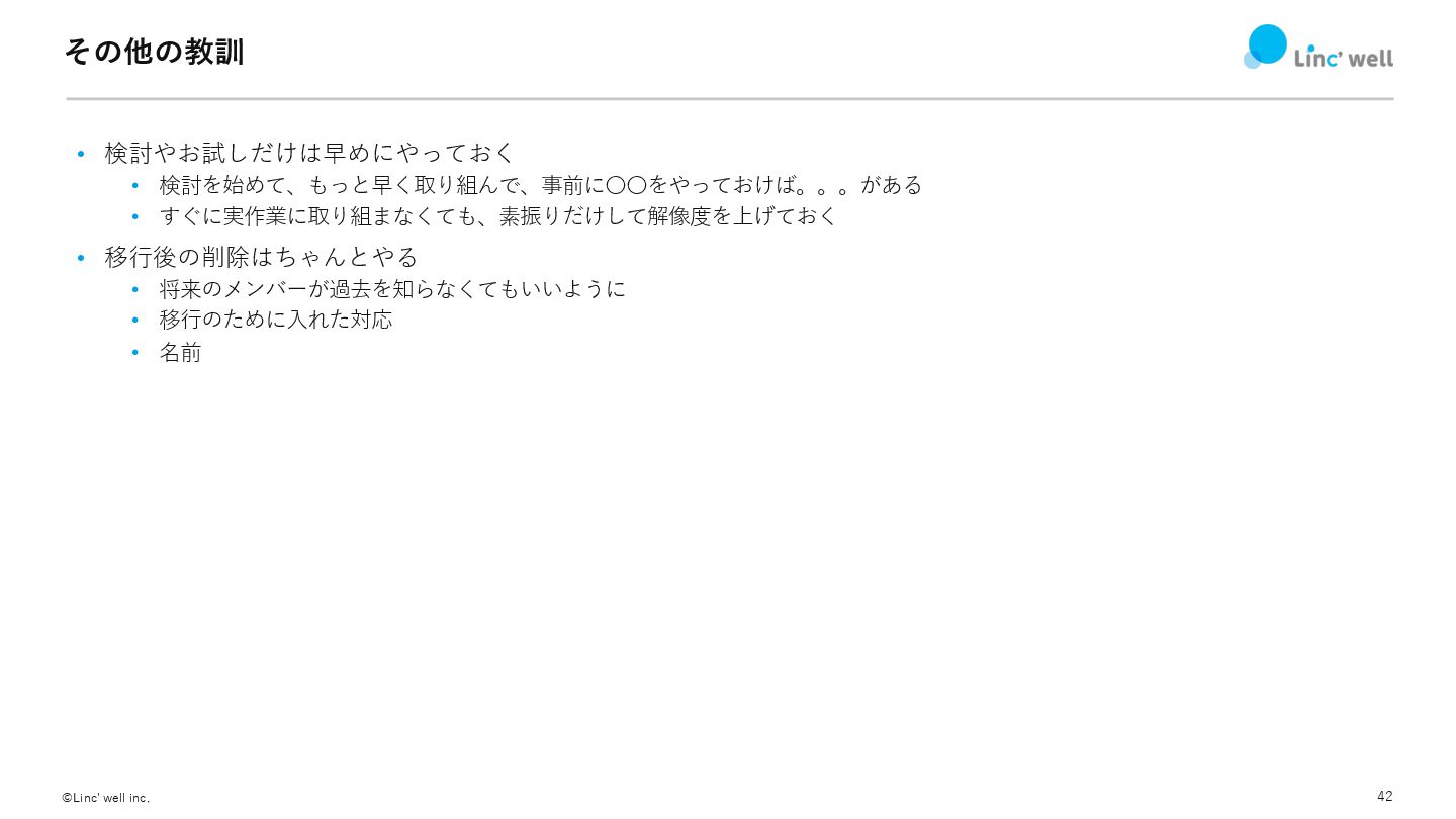 41 ©Linc' well inc. その他のおすすめ • 早めの段階からデプロイまでしておく • ⼩さい単位でもいいから、STG環境などにデプロイまではやっておく •