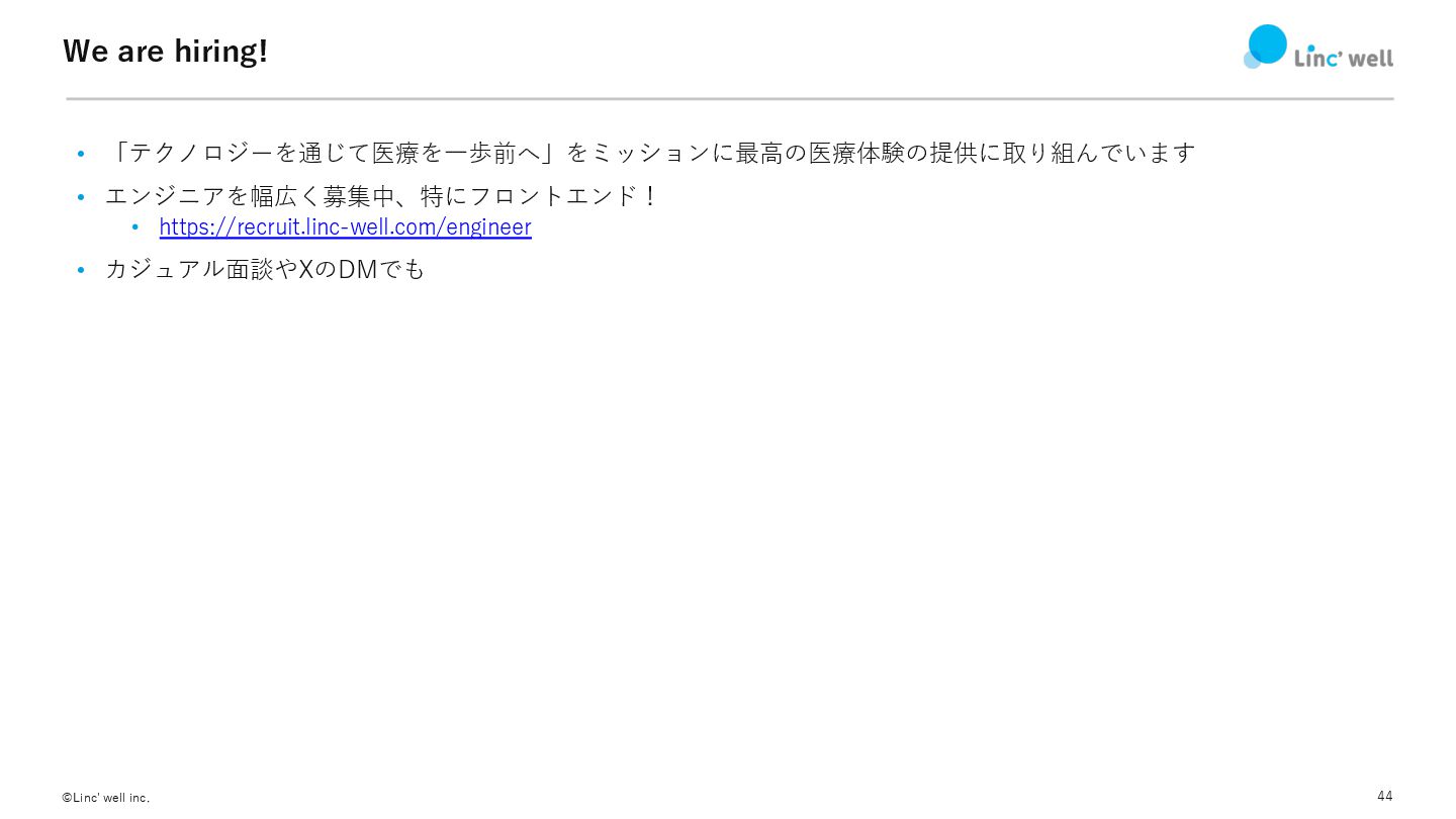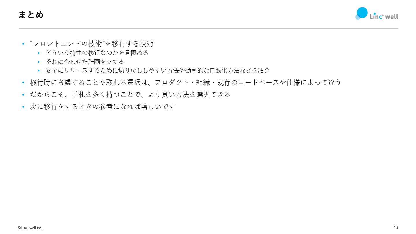 43 ©Linc' well inc. まとめ • “フロントエンドの技術”を移⾏する技術 • どういう特性の移⾏なのかを⾒極める •