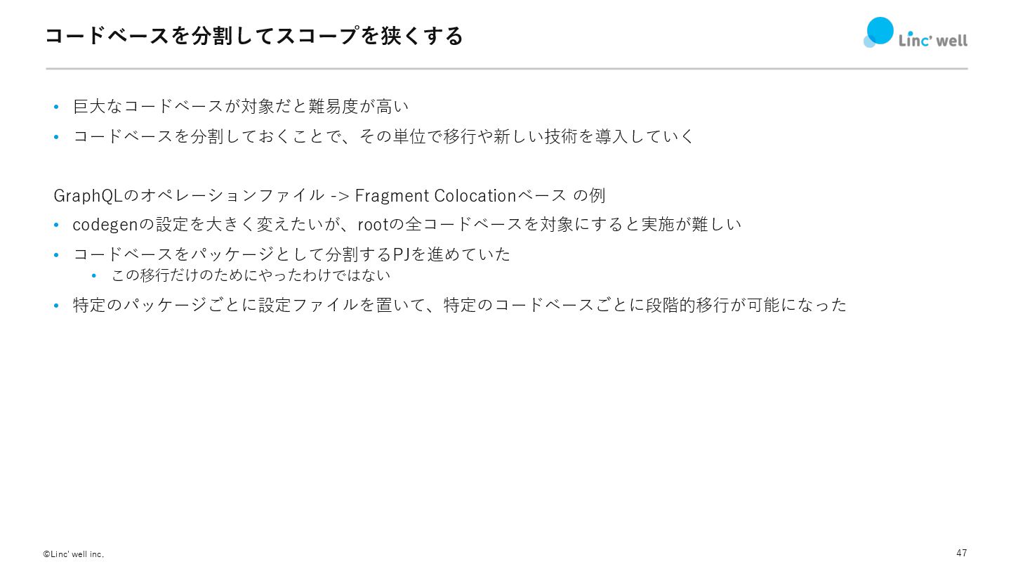 47 ©Linc' well inc. コードベースを分割してスコープを狭くする • 巨⼤なコードベースが対象だと難易度が⾼い • コードベースを分割しておくことで、その単位で移⾏や新しい技術を導⼊していく GraphQLのオペレーションファイル