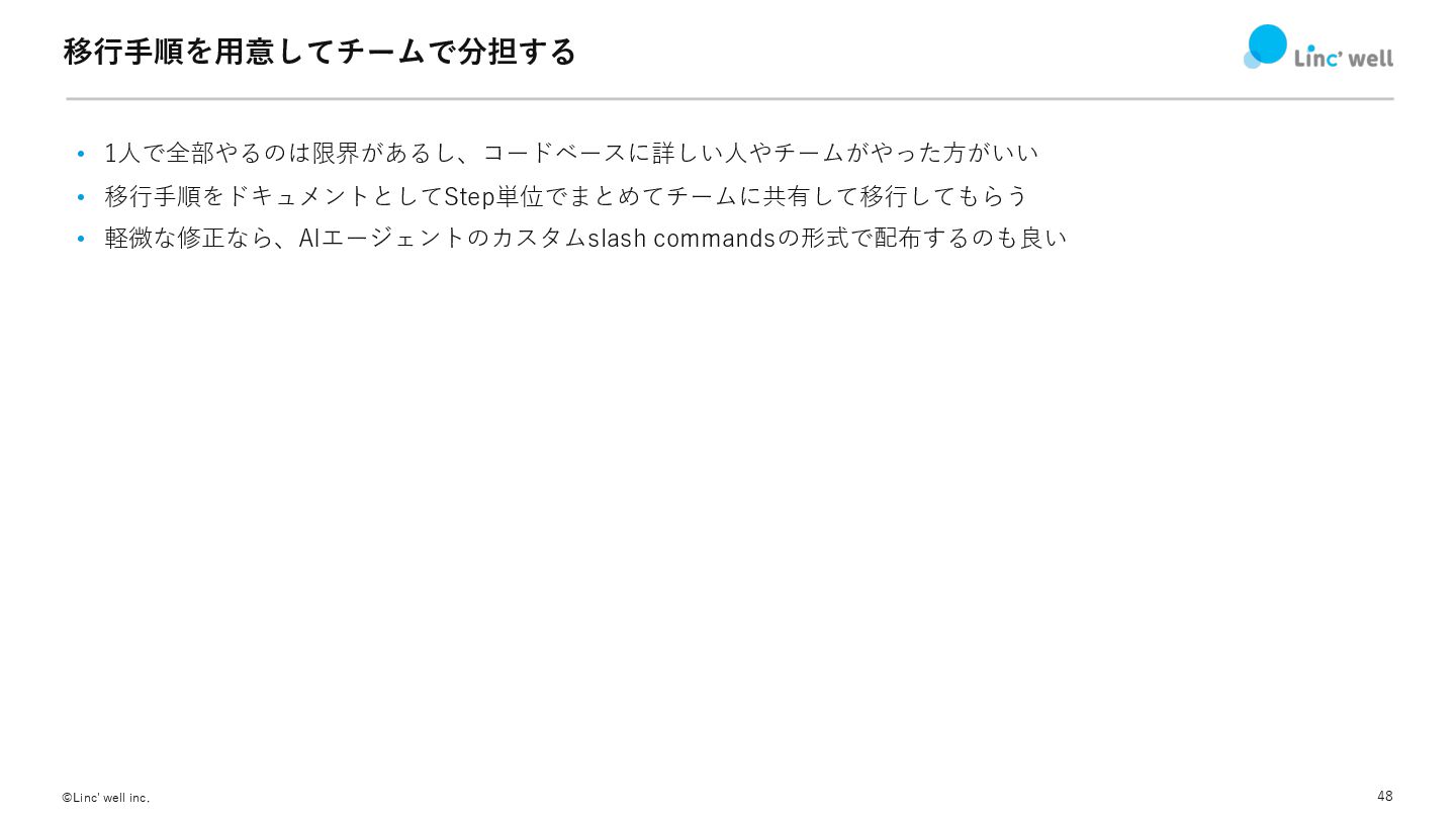 48 ©Linc' well inc. 移⾏⼿順を⽤意してチームで分担する • 1⼈で全部やるのは限界があるし、コードベースに詳しい⼈やチームがやった⽅がいい • 移⾏⼿順をドキュメントとしてStep単位でまとめてチームに共有して移⾏してもらう •