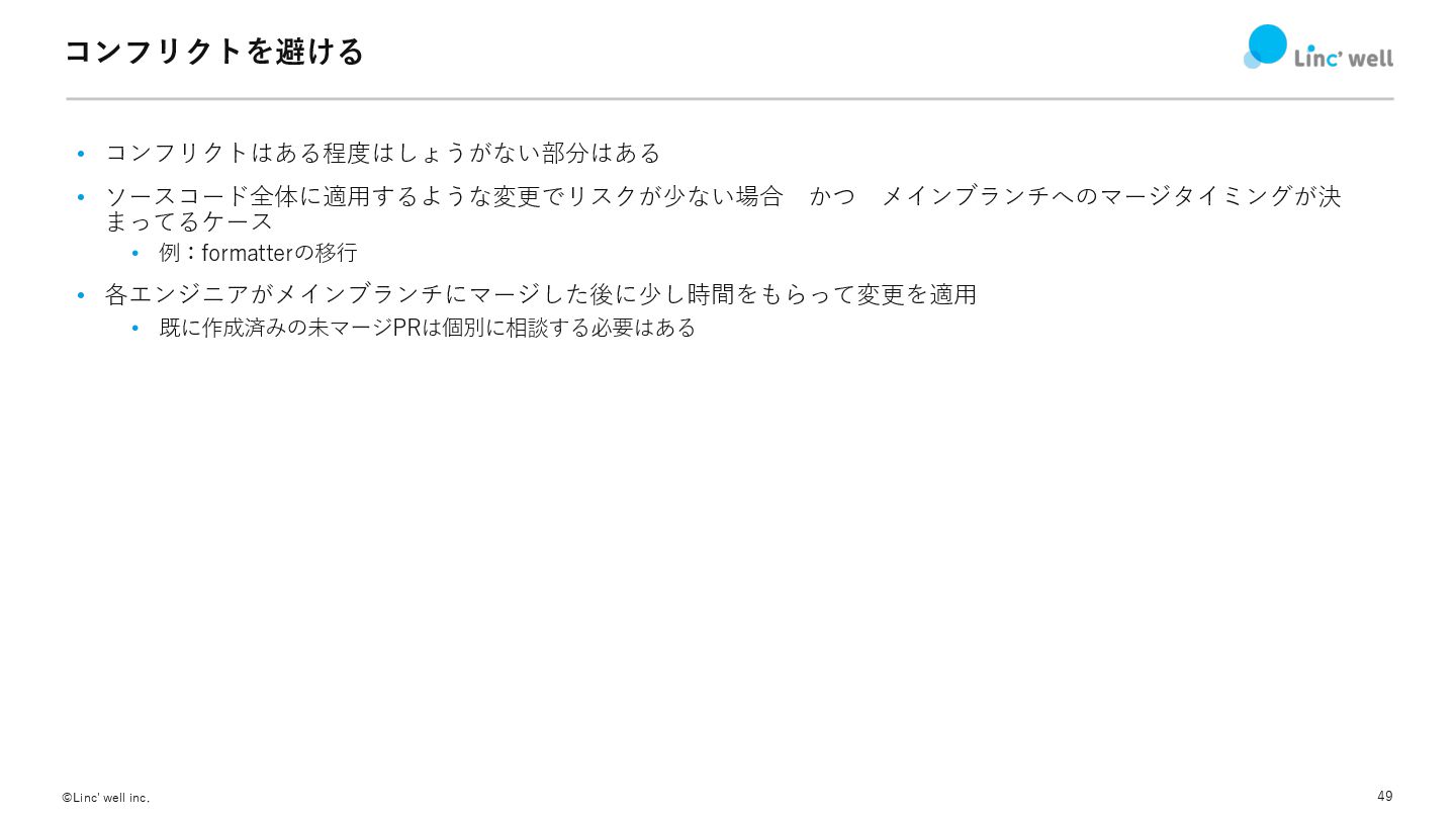 49 ©Linc' well inc. コンフリクトを避ける • コンフリクトはある程度はしょうがない部分はある • ソースコード全体に適⽤するような変更でリスクが少ない場合 かつ