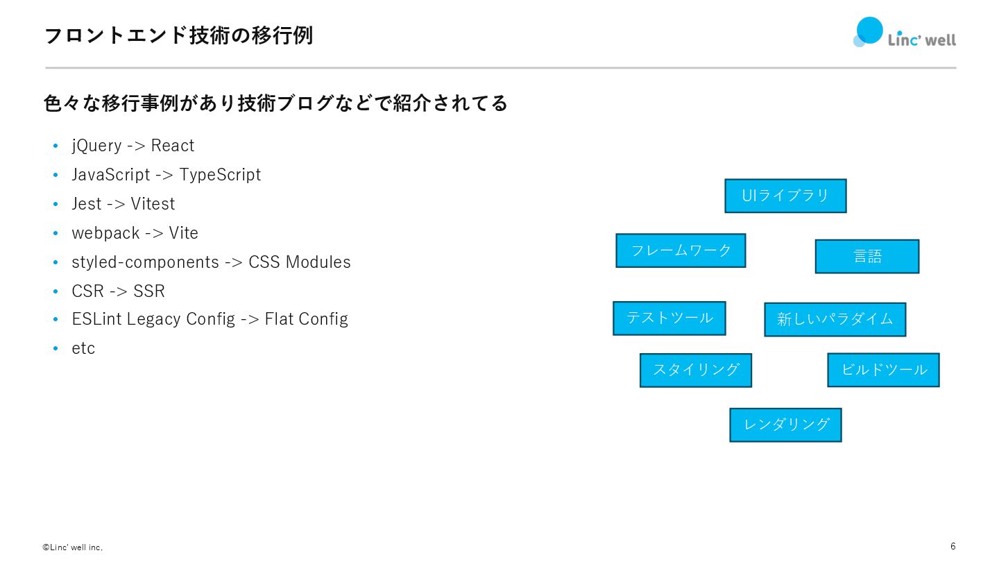 6 ©Linc' well inc. フロントエンド技術の移⾏例 ⾊々な移⾏事例があり技術ブログなどで紹介されてる • jQuery -> React
