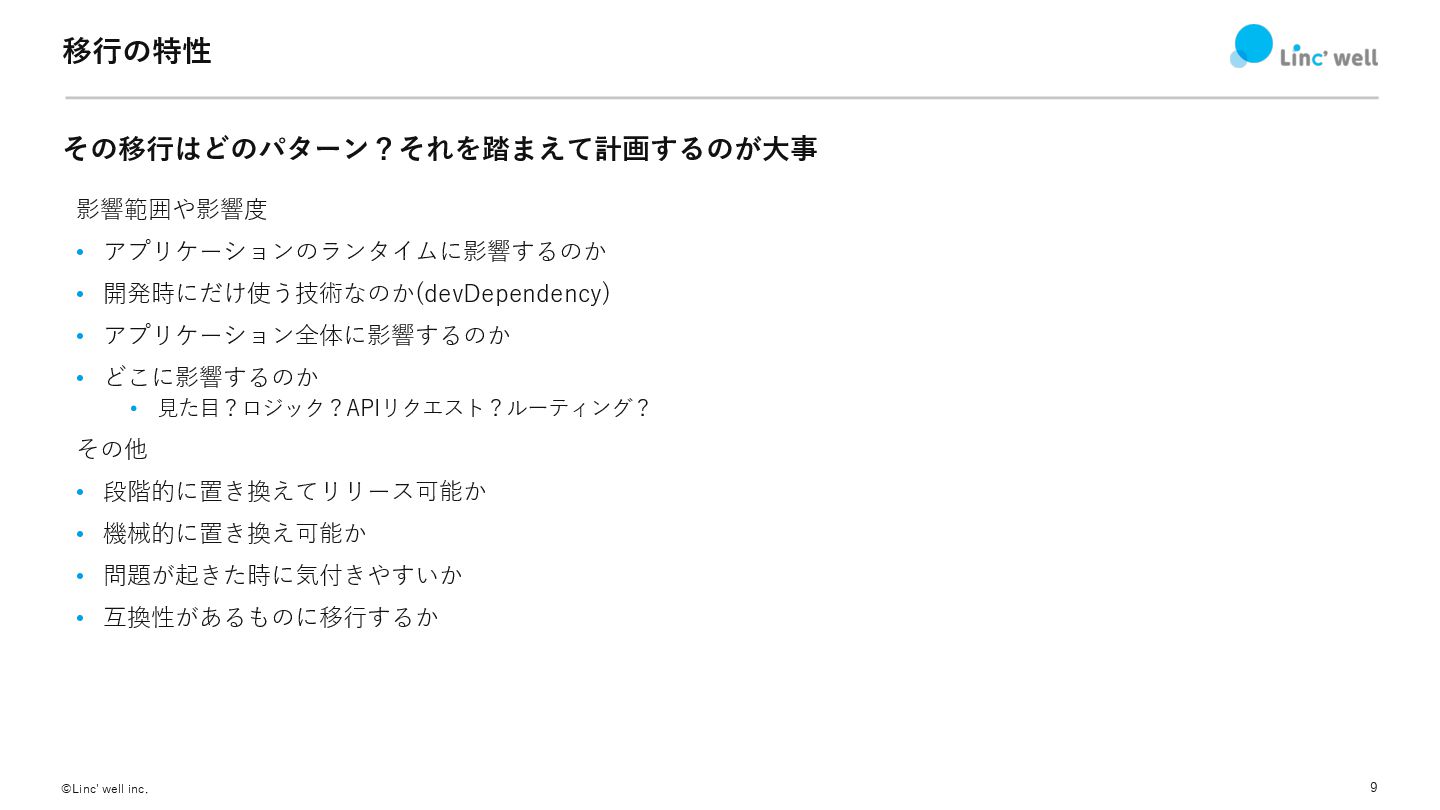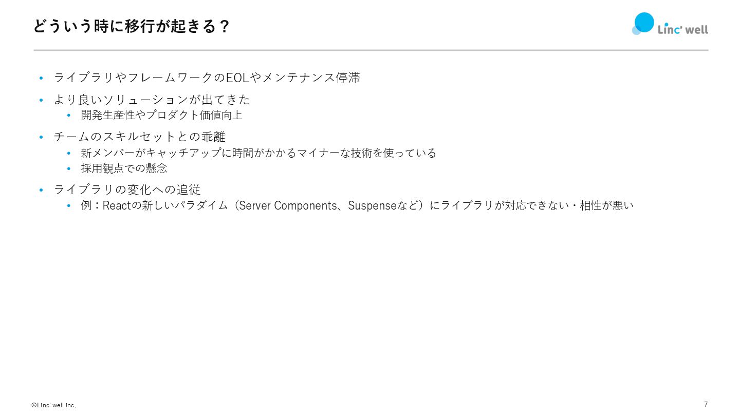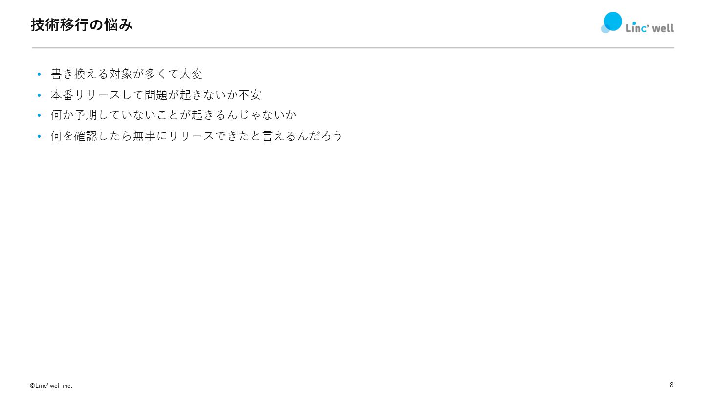 7 ©Linc' well inc. どういう時に移⾏が起きる? • ライブラリやフレームワークのEOLやメンテナンス停滞 • より良いソリューションが出てきた •