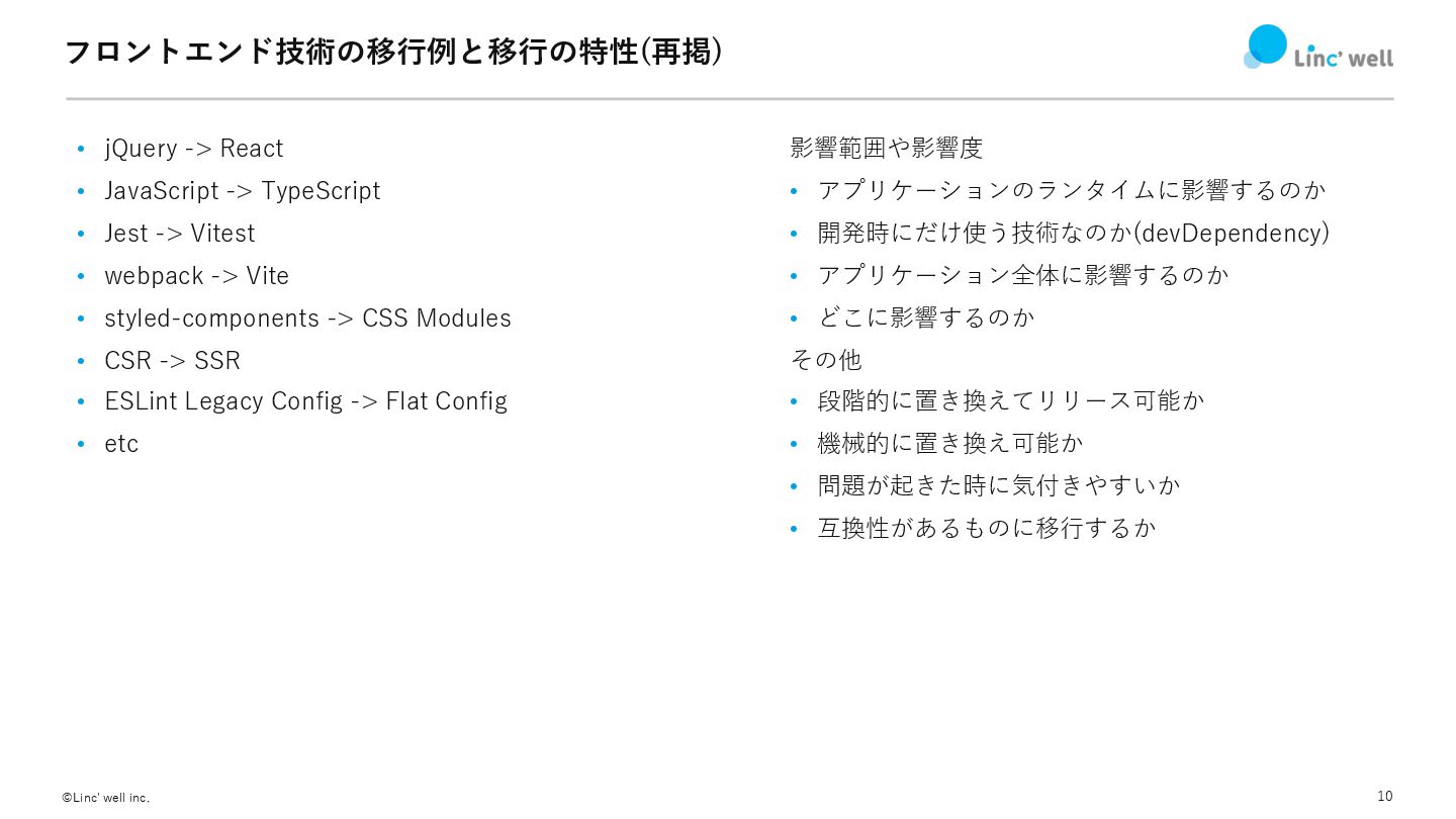 JavaScript -> TypeScript • Jest -> Vitest • webpack -> Vite • styled-components -> CSS Modules • CSR -> SSR • ESLint Legacy Config -> Flat Config • etc 影響範囲や影響度 • アプリケーションのランタイムに影響するのか • 開発時にだけ使う技術なのか(devDependency) • アプリケーション全体に影響するのか • どこに影響するのか その他 • 段階的に置き換えてリリース可能か • 機械的に置き換え可能か • 問題が起きた時に気付きやすいか • 互換性があるものに移⾏するか