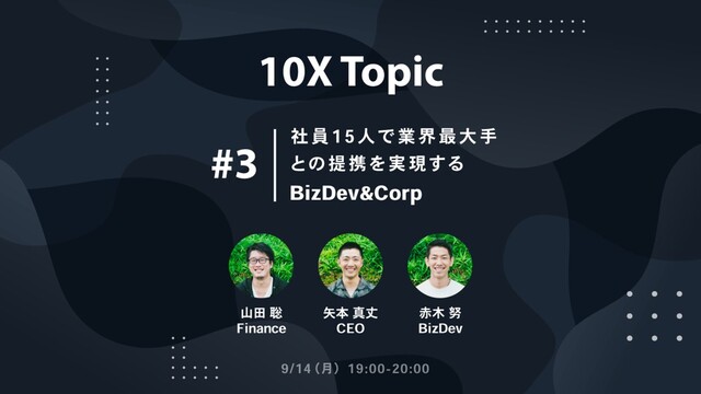 2020/9/14に開催されたオンラインイベント「10X Topic #3 社員15人で業界最大手との提携を実現するBizDev&Corp」のスライドです。
