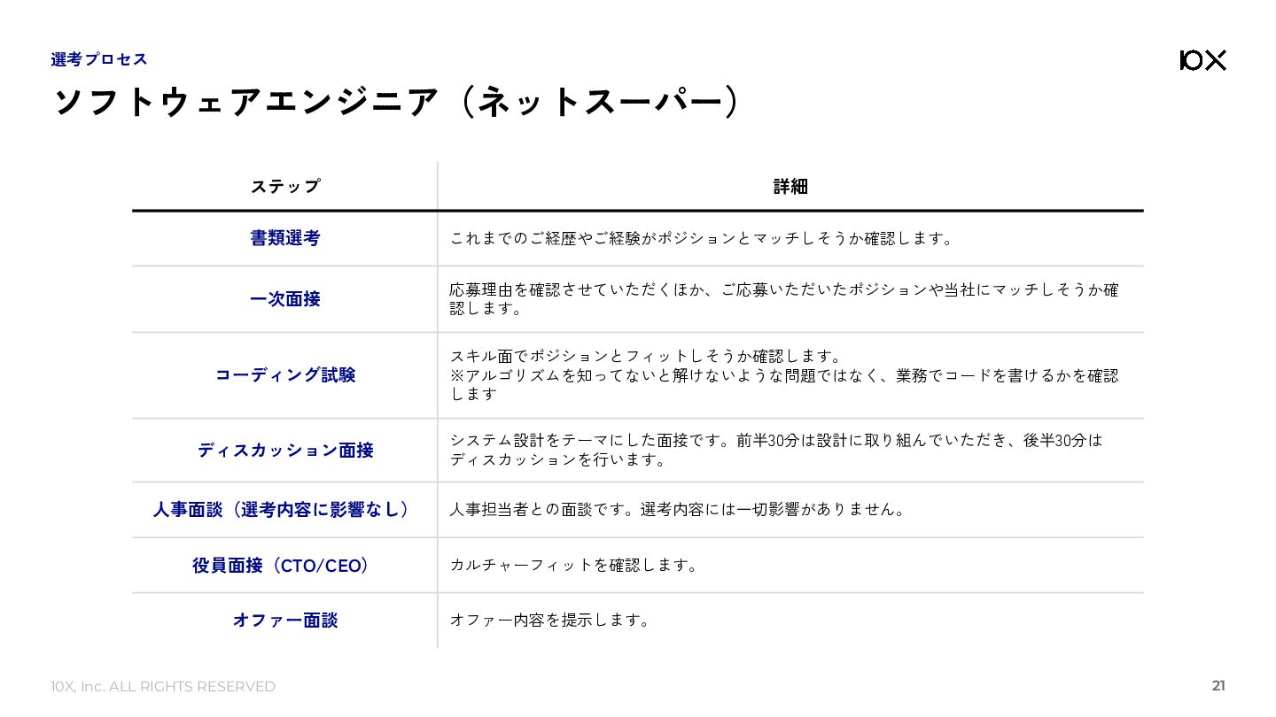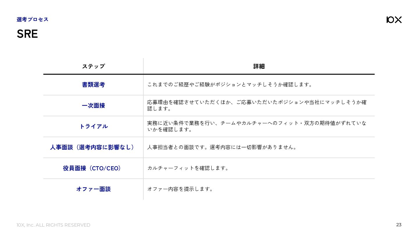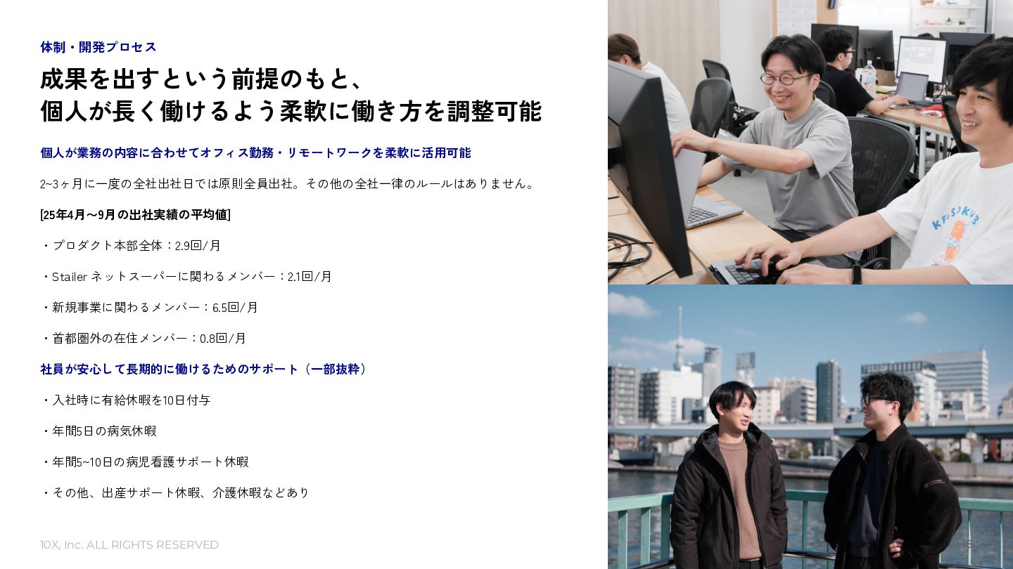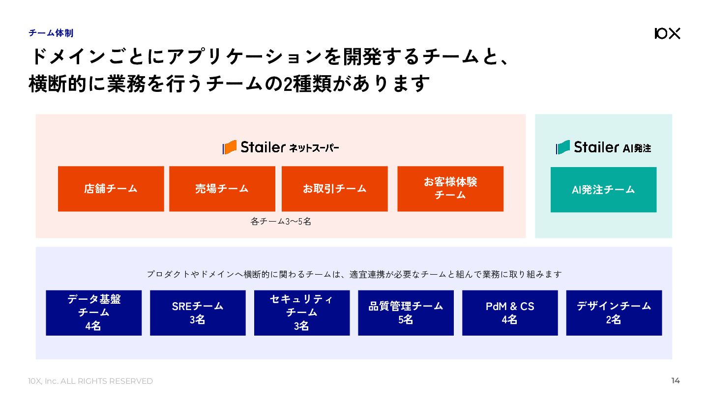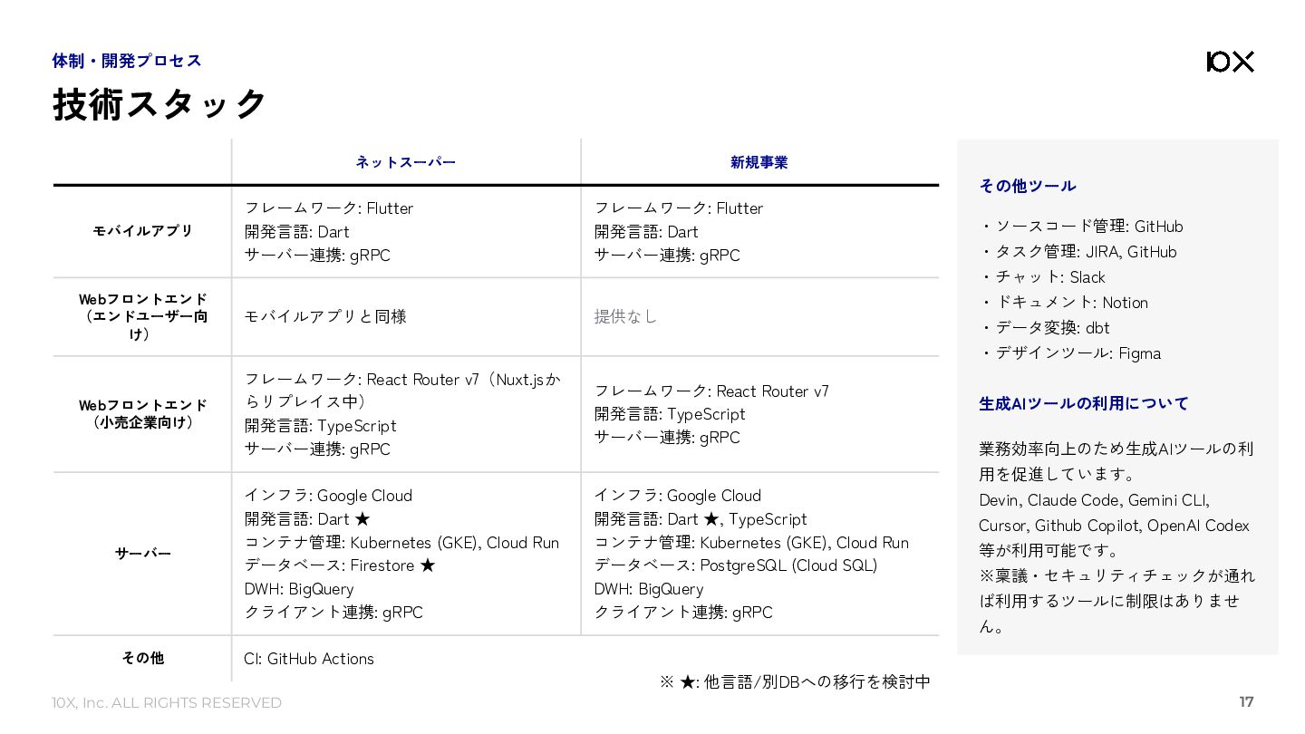 モバイルアプリ フレームワーク: Flutter 開発言語: Dart サーバー連携: gRPC フレームワーク: Flutter 開発言語: Dart サーバー連携: gRPC Webフロントエンド (エンドユーザー向 け) モバイルアプリと同様 提供なし Webフロントエンド (小売企業向け) フレームワーク: React Router v7(Nuxt.jsか らリプレイス中) 開発言語: TypeScript サーバー連携: gRPC フレームワーク: React Router v7 開発言語: TypeScript サーバー連携: gRPC サーバー インフラ: Google Cloud 開発言語: Dart ★ コンテナ管理: Kubernetes (GKE), Cloud Run データベース: Firestore ★ DWH: BigQuery クライアント連携: gRPC インフラ: Google Cloud 開発言語: Dart ★, TypeScript コンテナ管理: Kubernetes (GKE), Cloud Run データベース: PostgreSQL (Cloud SQL) DWH: BigQuery クライアント連携: gRPC その他 CI: GitHub Actions その他ツール ・ソースコード管理: GitHub ・タスク管理: JIRA, GitHub ・チャット: Slack ・ドキュメント: Notion ・データ変換: dbt ・デザインツール: Figma 生成AIツールの利用について 業務効率向上のため生成AIツールの利 用を促進しています。 Devin, Claude Code, Gemini CLI, Cursor, Github Copilot, OpenAI Codex 等が利用可能です。 ※稟議・セキュリティチェックが通れ ば利用するツールに制限はありませ ん。 ※ ★: 他言語/別DBへの移行を検討中