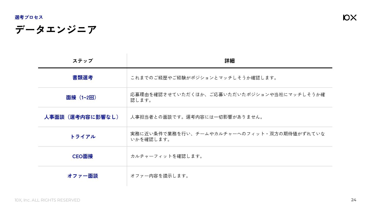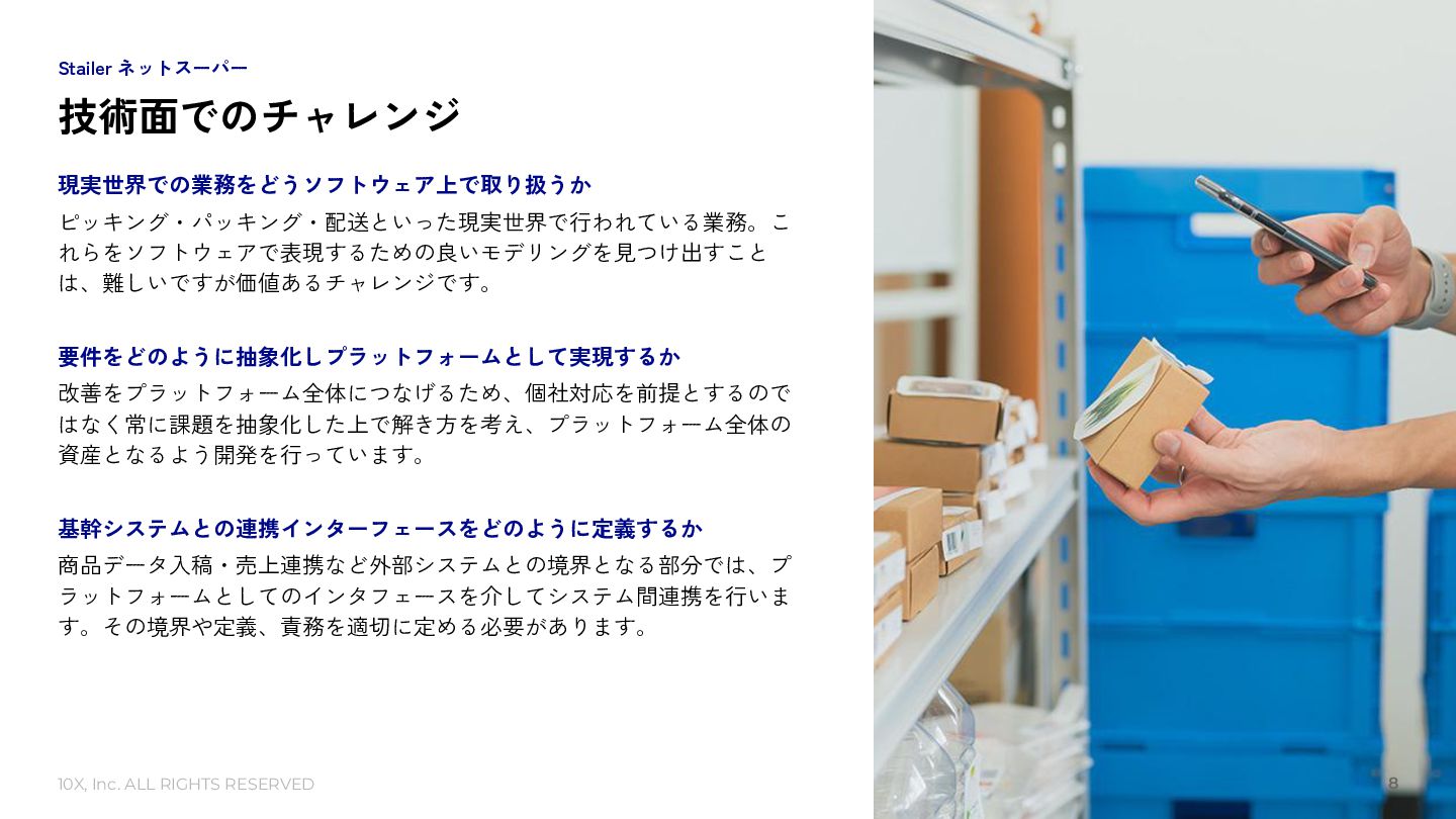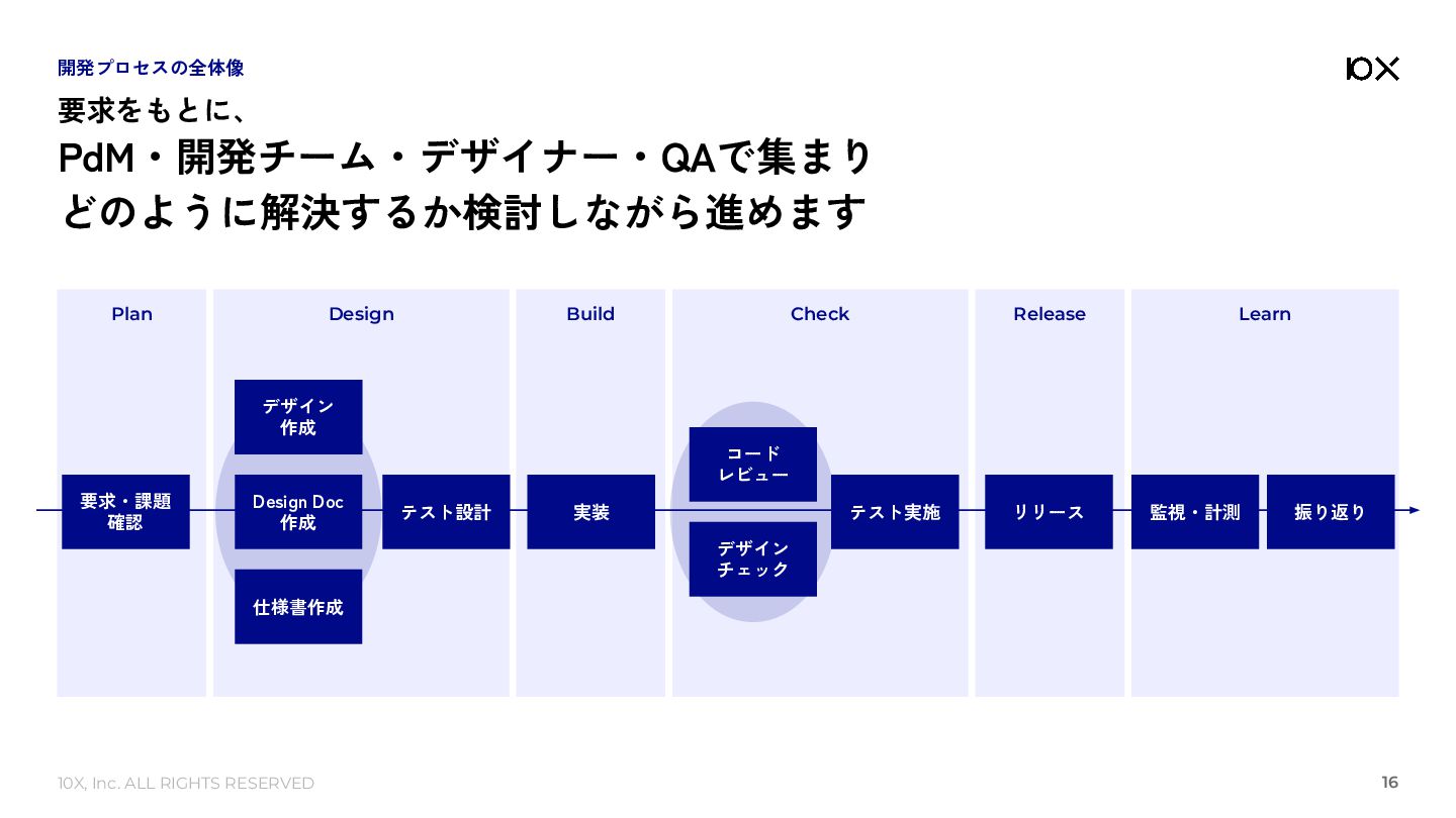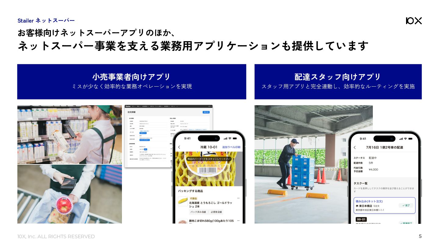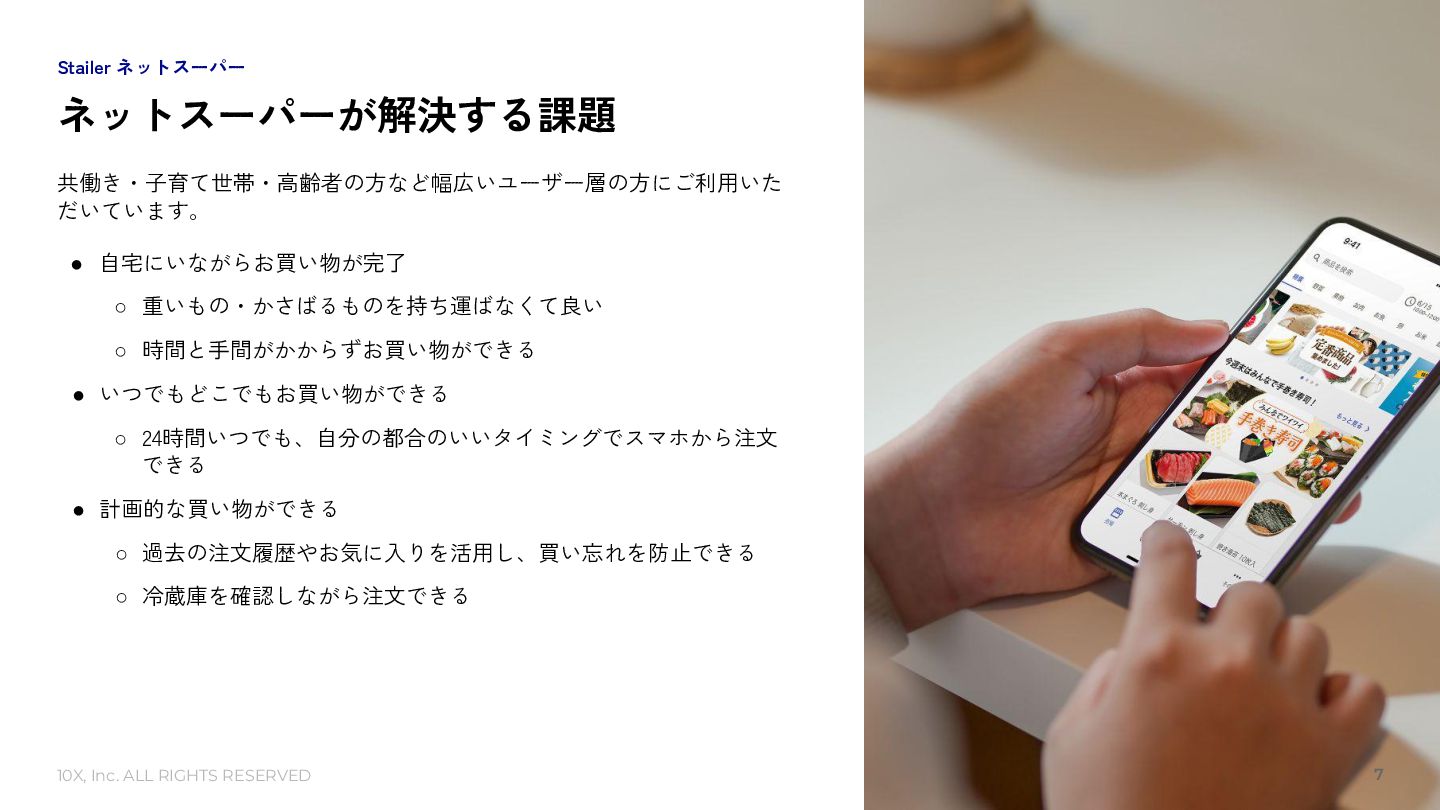 モバイルアプリ フレームワーク: Flutter 開発言語: Dart サーバー連携: gRPC フレームワーク: Flutter 開発言語: Dart サーバー連携: gRPC Webフロントエンド (エンドユーザー向 け) モバイルアプリと同様 提供なし Webフロントエンド (小売企業向け) フレームワーク: React Router v7(Nuxt.jsか らリプレイス中) 開発言語: TypeScript サーバー連携: gRPC フレームワーク: React Router v7 開発言語: TypeScript サーバー連携: gRPC サーバー インフラ: Google Cloud 開発言語: Dart ★ コンテナ管理: Kubernetes (GKE), Cloud Run データベース: Firestore ★ DWH: BigQuery クライアント連携: gRPC インフラ: Google Cloud 開発言語: Dart ★, TypeScript コンテナ管理: Kubernetes (GKE), Cloud Run データベース: PostgreSQL (Cloud SQL) DWH: BigQuery クライアント連携: gRPC その他 CI: GitHub Actions その他ツール ・ソースコード管理: GitHub ・タスク管理: JIRA, GitHub ・チャット: Slack ・ドキュメント: Notion ・データ変換: dbt ・デザインツール: Figma 生成AIツールの利用について 業務効率向上のため生成AIツールの利 用を促進しています。 Devin, Claude Code, Gemini CLI, Cursor, Github Copilot, OpenAI Codex 等が利用可能です。 ※稟議・セキュリティチェックが通れ ば利用するツールに制限はありませ ん。 ※ ★: 他言語/別DBへの移行を検討中
