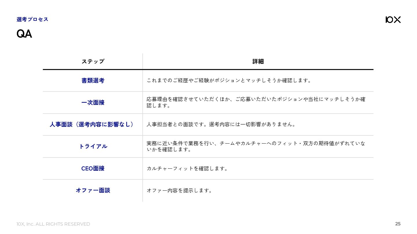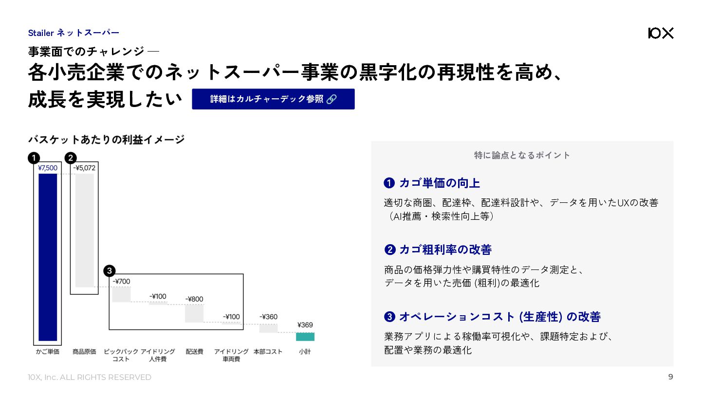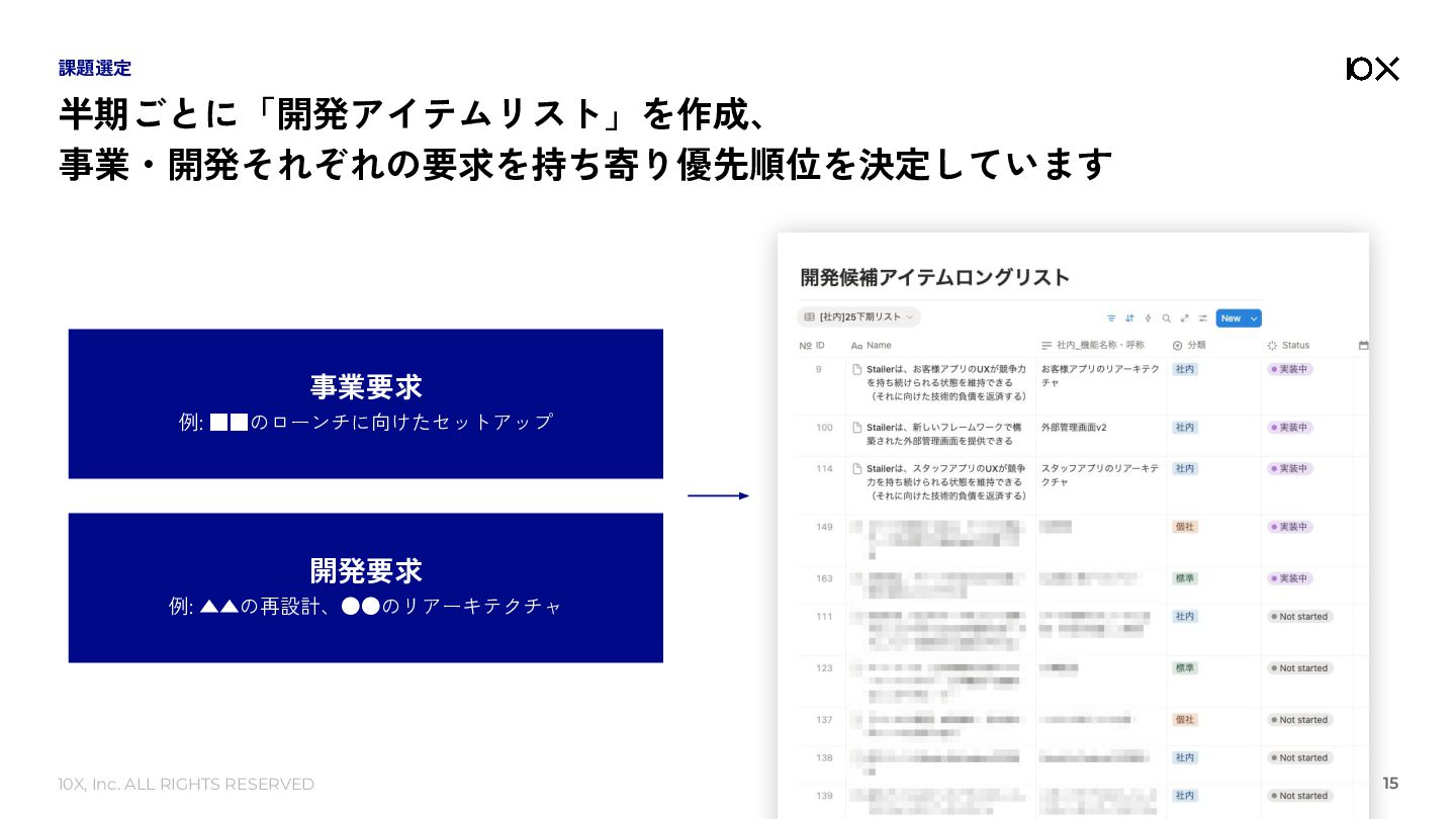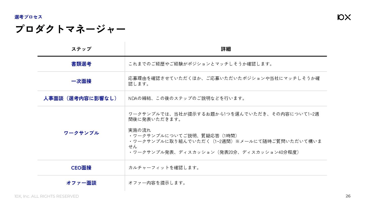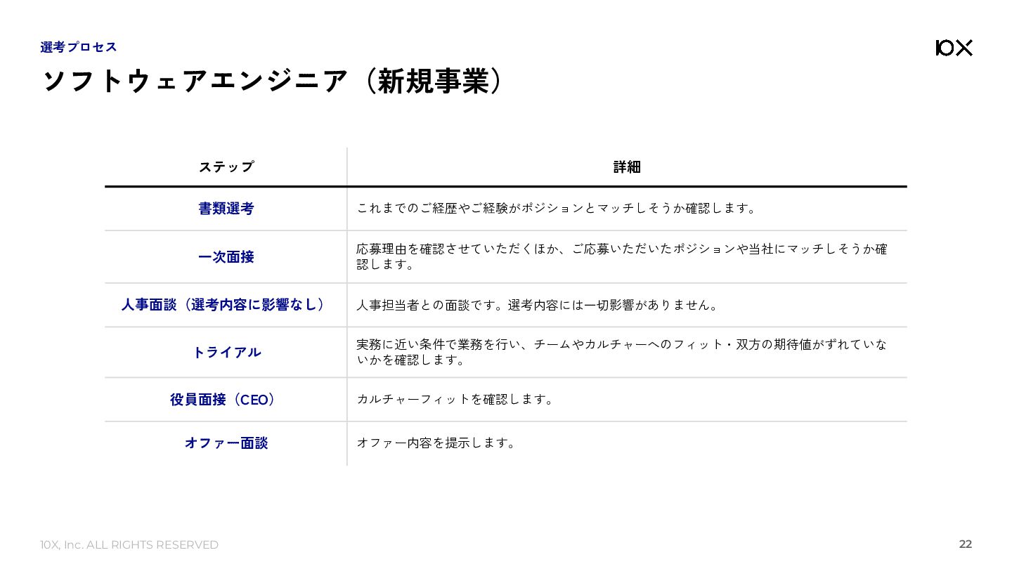 モバイルアプリ フレームワーク: Flutter 開発言語: Dart サーバー連携: gRPC フレームワーク: Flutter 開発言語: Dart サーバー連携: gRPC Webフロントエンド (エンドユーザー向 け) モバイルアプリと同様 提供なし Webフロントエンド (小売企業向け) フレームワーク: React Router v7(Nuxt.jsか らリプレイス中) 開発言語: TypeScript サーバー連携: gRPC フレームワーク: React Router v7 開発言語: TypeScript サーバー連携: gRPC サーバー インフラ: Google Cloud 開発言語: Dart ★ コンテナ管理: Kubernetes (GKE), Cloud Run データベース: Firestore ★ DWH: BigQuery クライアント連携: gRPC インフラ: Google Cloud 開発言語: Dart ★, TypeScript コンテナ管理: Kubernetes (GKE), Cloud Run データベース: PostgreSQL (Cloud SQL) DWH: BigQuery クライアント連携: gRPC その他 CI: GitHub Actions その他ツール ・ソースコード管理: GitHub ・タスク管理: JIRA, GitHub ・チャット: Slack ・ドキュメント: Notion ・データ変換: dbt ・デザインツール: Figma 生成AIツールの利用について 業務効率向上のため生成AIツールの利 用を促進しています。 Devin, Claude Code, Gemini CLI, Cursor, Github Copilot, OpenAI Codex 等が利用可能です。 ※稟議・セキュリティチェックが通れ ば利用するツールに制限はありませ ん。 ※ ★: 他言語/別DBへの移行を検討中