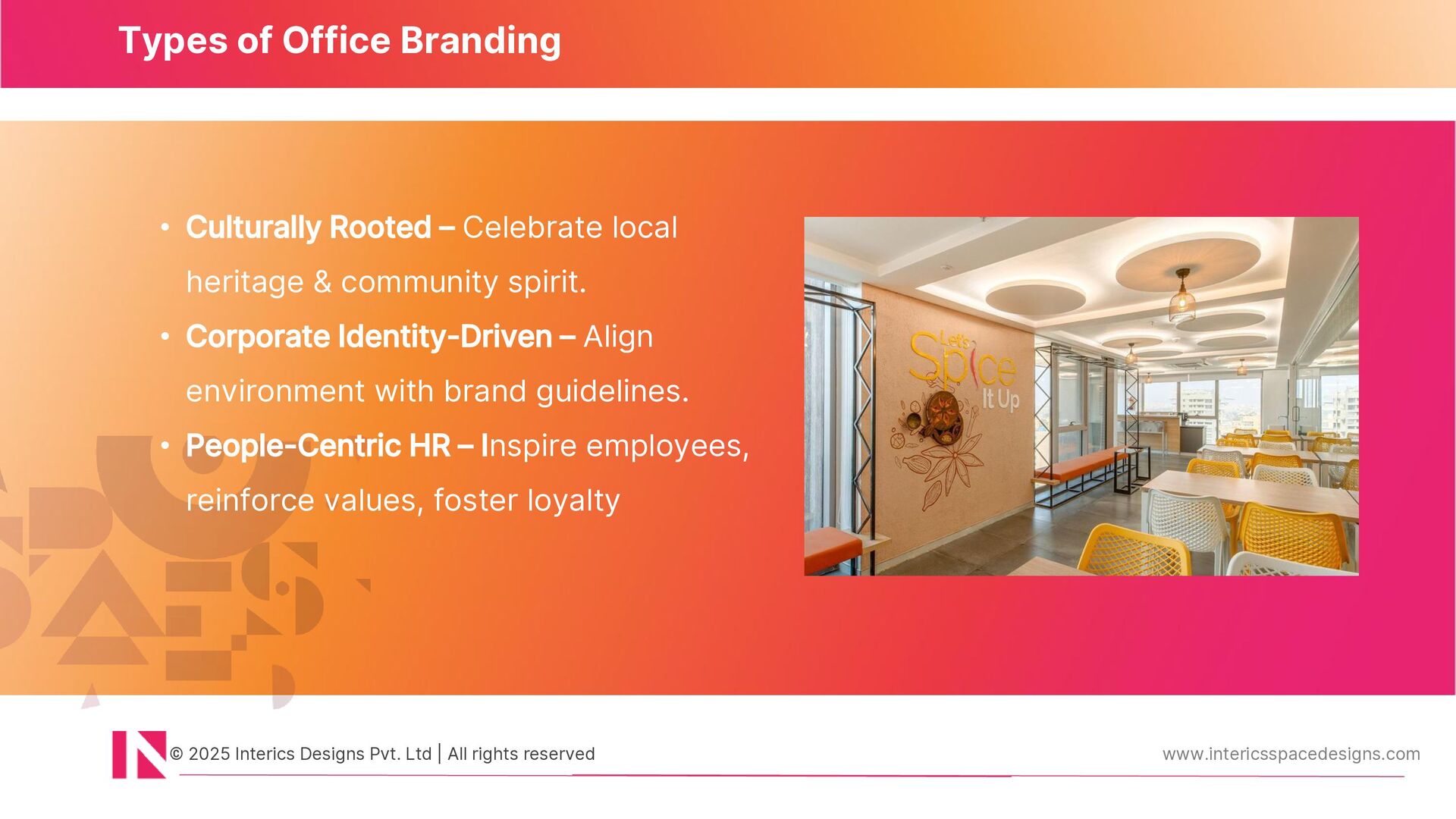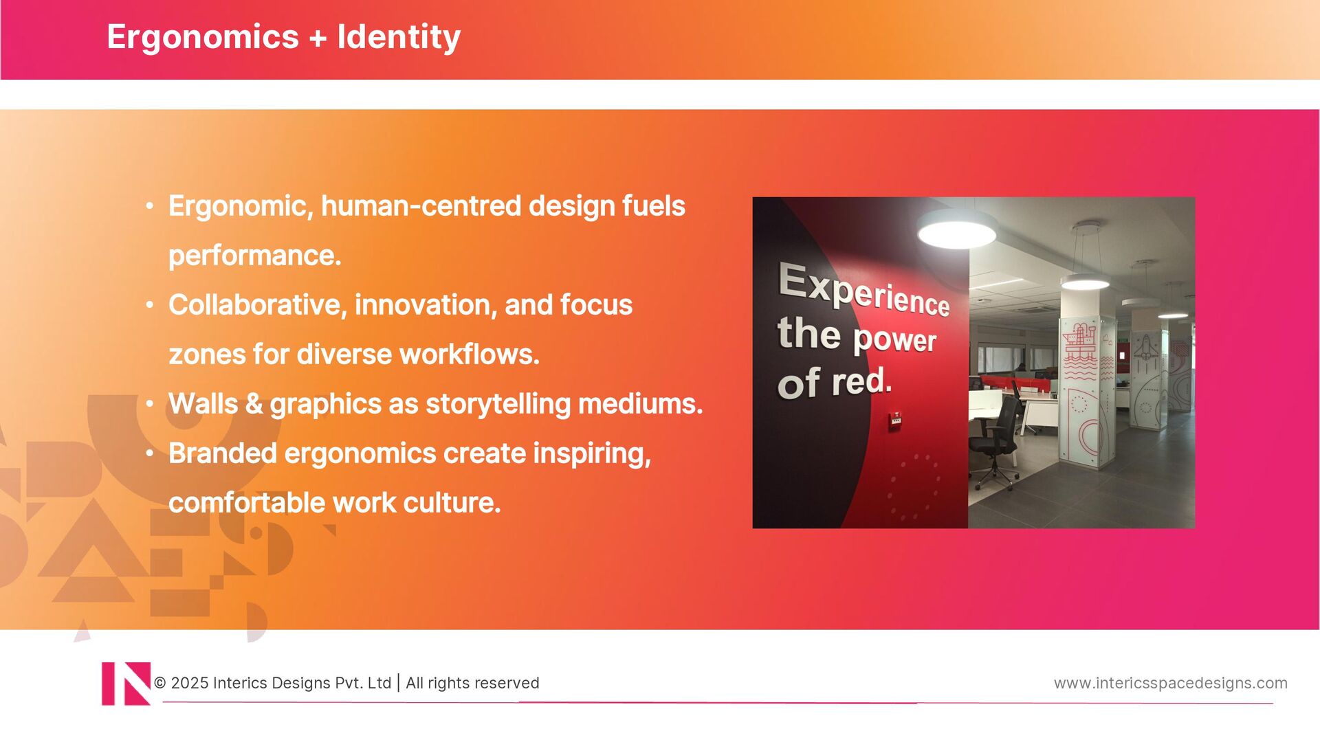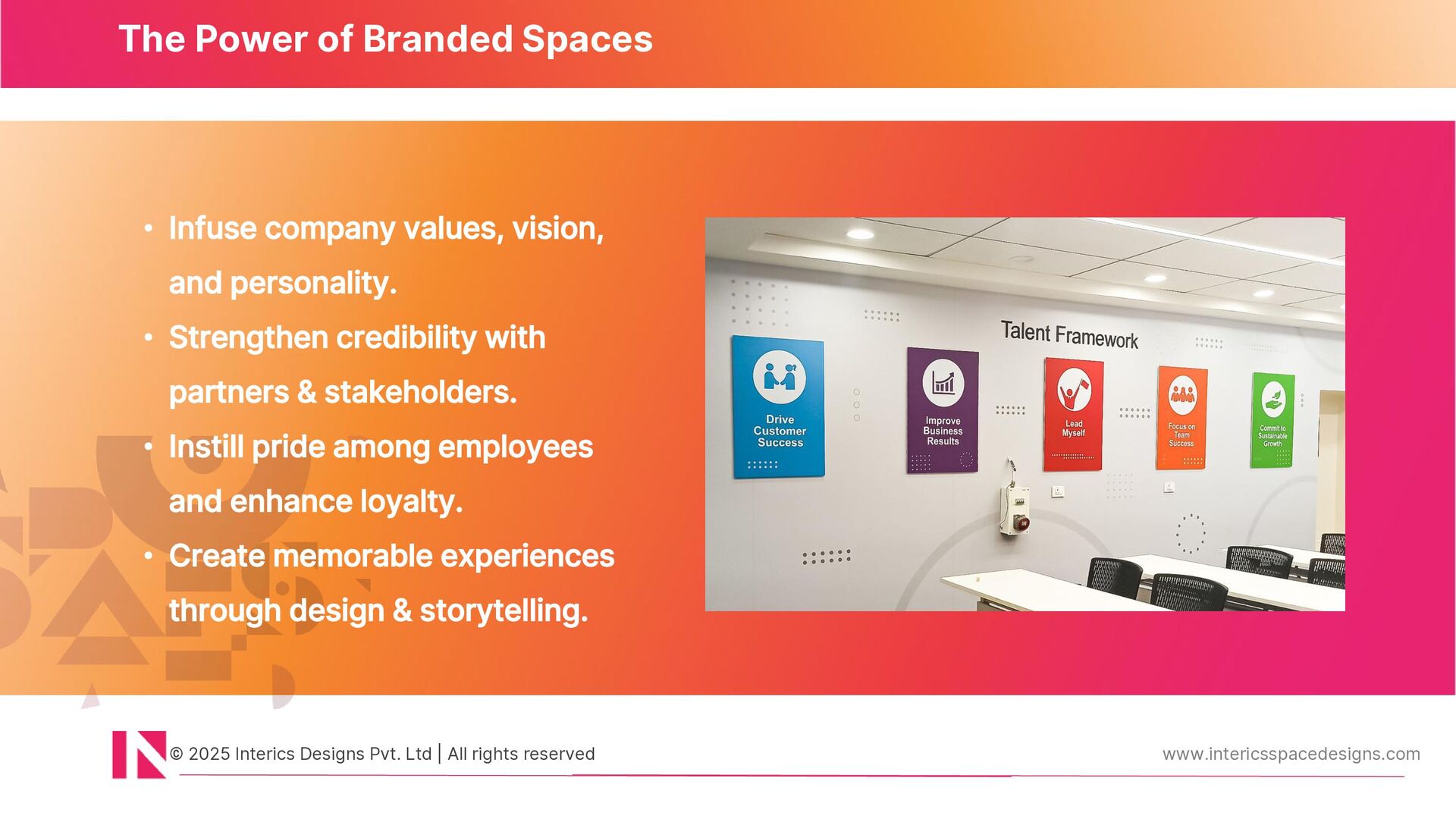 Transform your workspace into a powerful expression of your company’s identity with Interics InSpace. In today’s dynamic corporate world, office spaces are more than just functional—they are storytellers that reflect your brand’s values, culture, and vision. From culturally rooted designs that celebrate regional heritage to corporate identity-driven environments and people-centric HR branding, Interics creates workspaces that inspire employees, impress visitors, and strengthen trust. Our strategic approach blends creativity, functionality, and brand storytelling to design offices that motivate teams, enhance productivity, and leave a lasting impression.