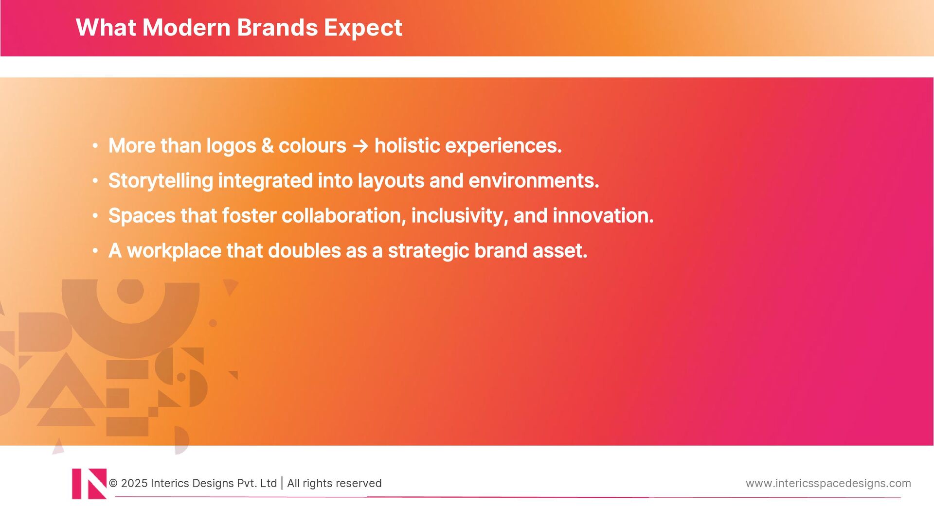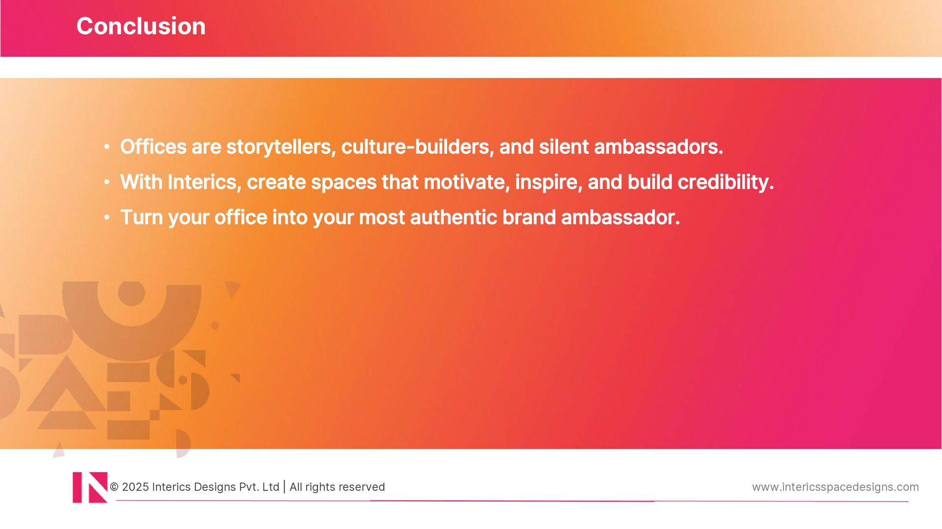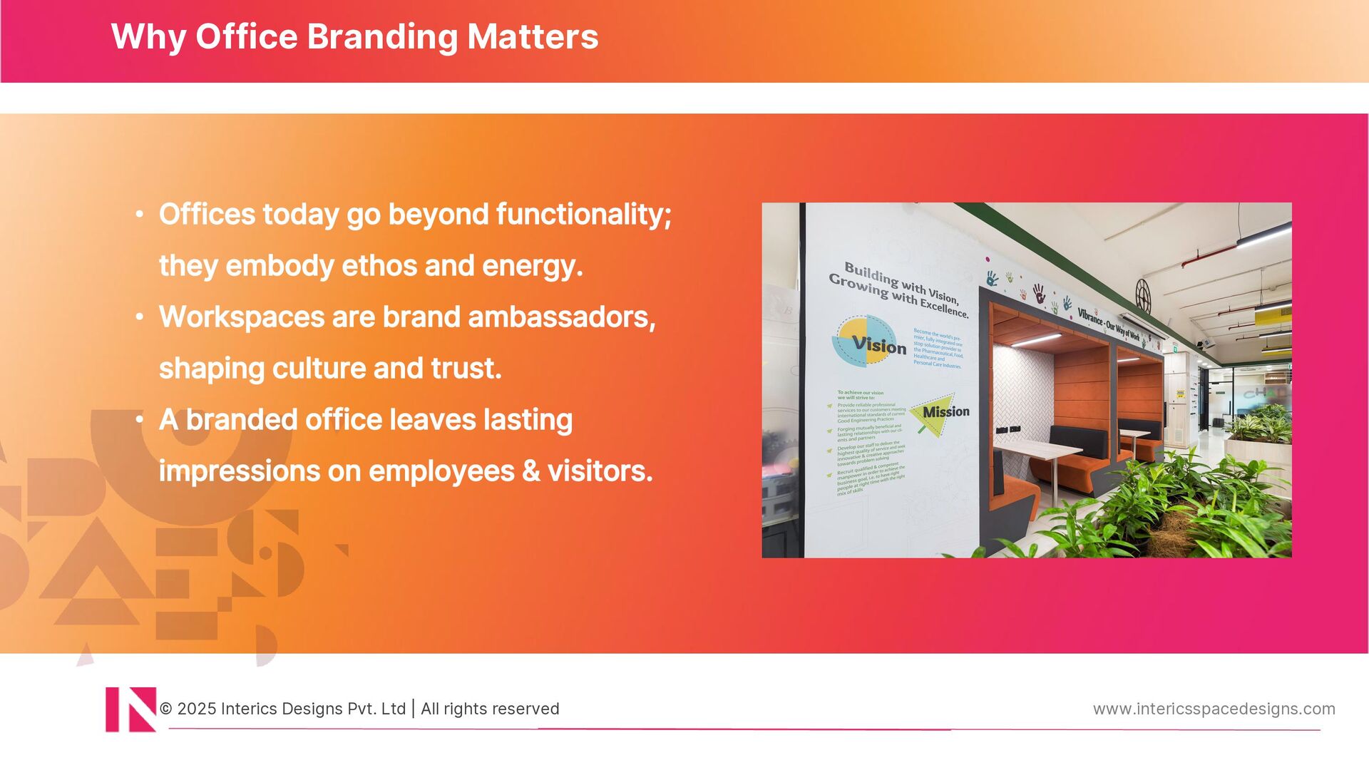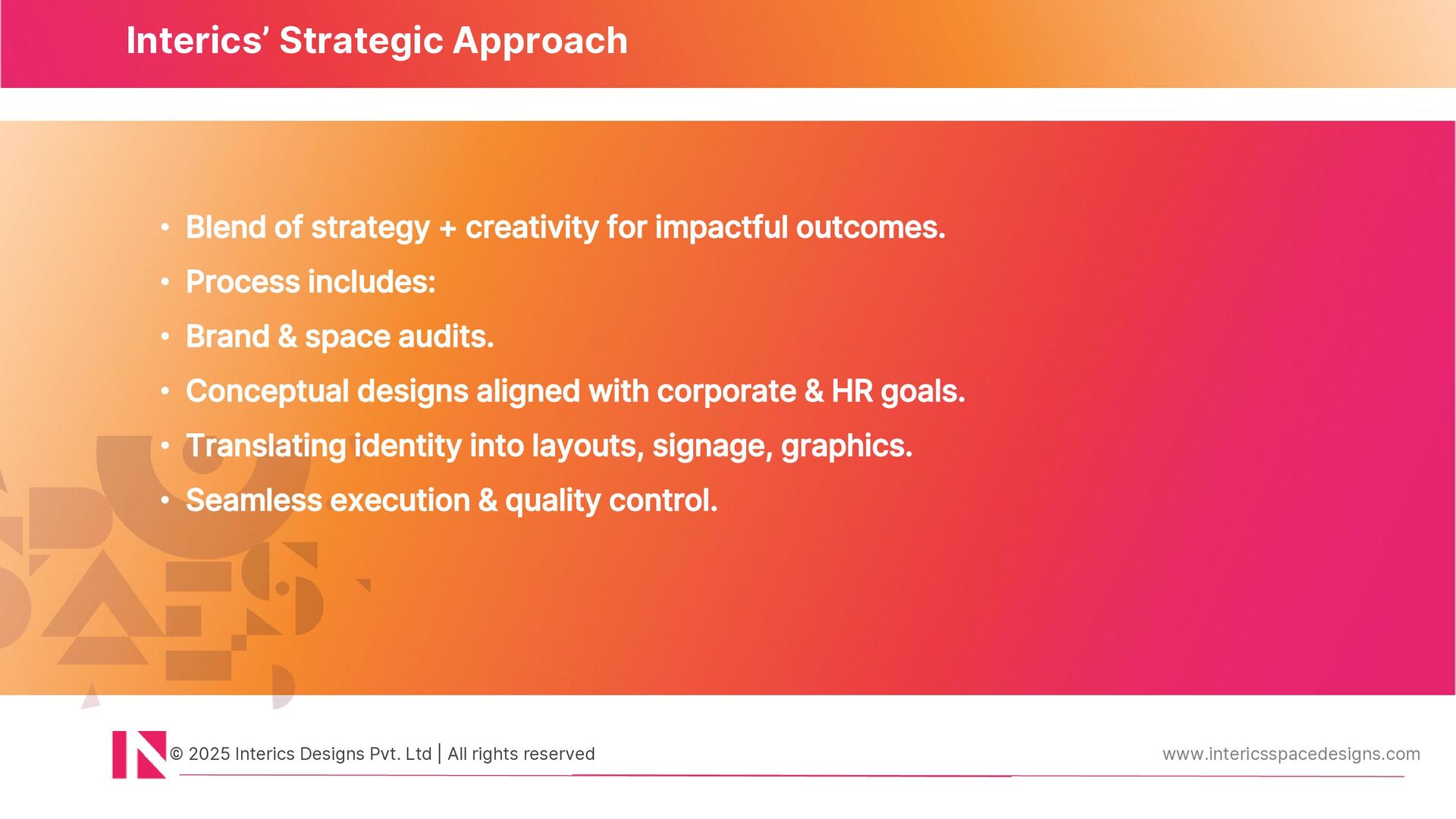 Transform your workspace into a powerful expression of your company’s identity with Interics InSpace. In today’s dynamic corporate world, office spaces are more than just functional—they are storytellers that reflect your brand’s values, culture, and vision. From culturally rooted designs that celebrate regional heritage to corporate identity-driven environments and people-centric HR branding, Interics creates workspaces that inspire employees, impress visitors, and strengthen trust. Our strategic approach blends creativity, functionality, and brand storytelling to design offices that motivate teams, enhance productivity, and leave a lasting impression.