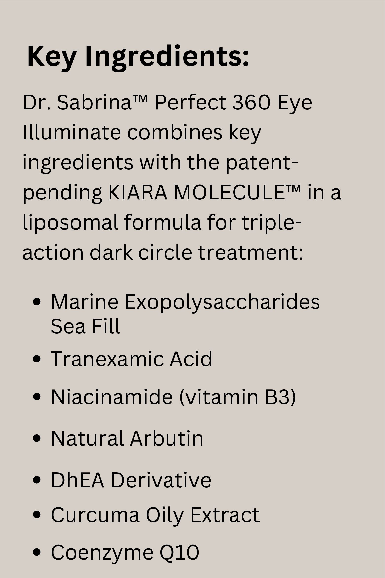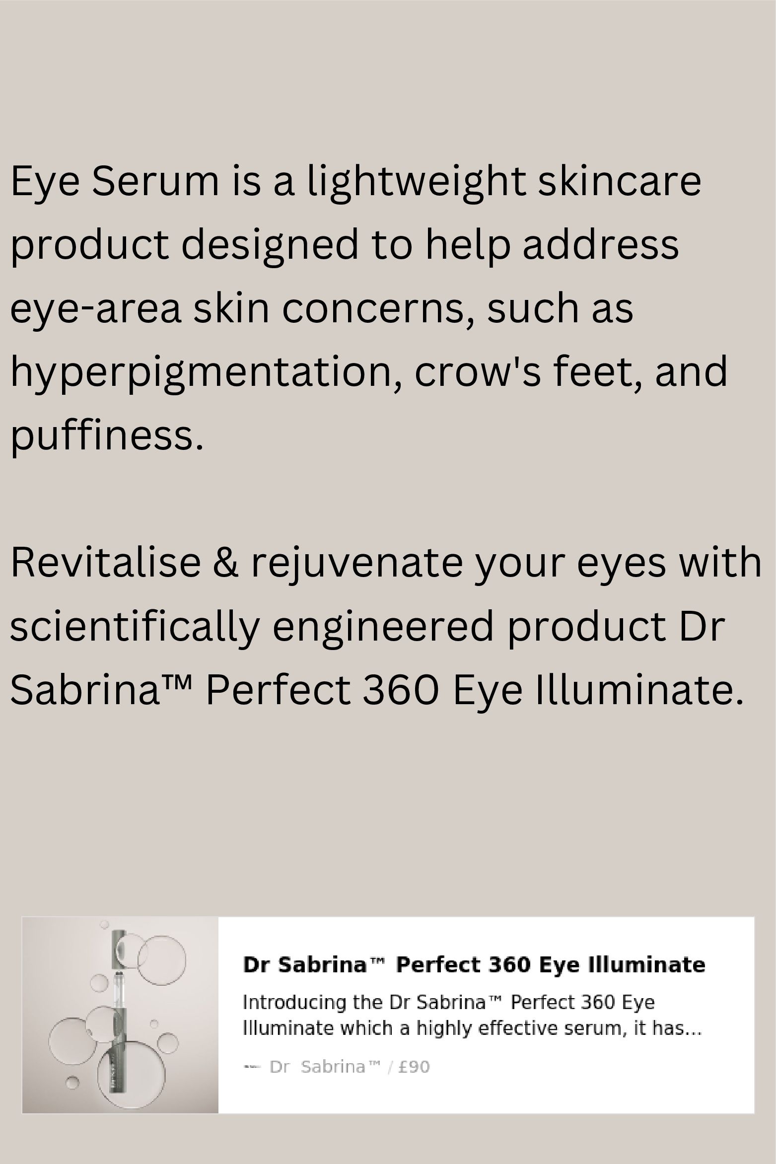 address eye-area skin concerns, such as hyperpigmentation, crow's feet, and puffiness. Revitalise & rejuvenate your eyes with scientifically engineered product Dr Sabrina™ Perfect 360 Eye Illuminate.