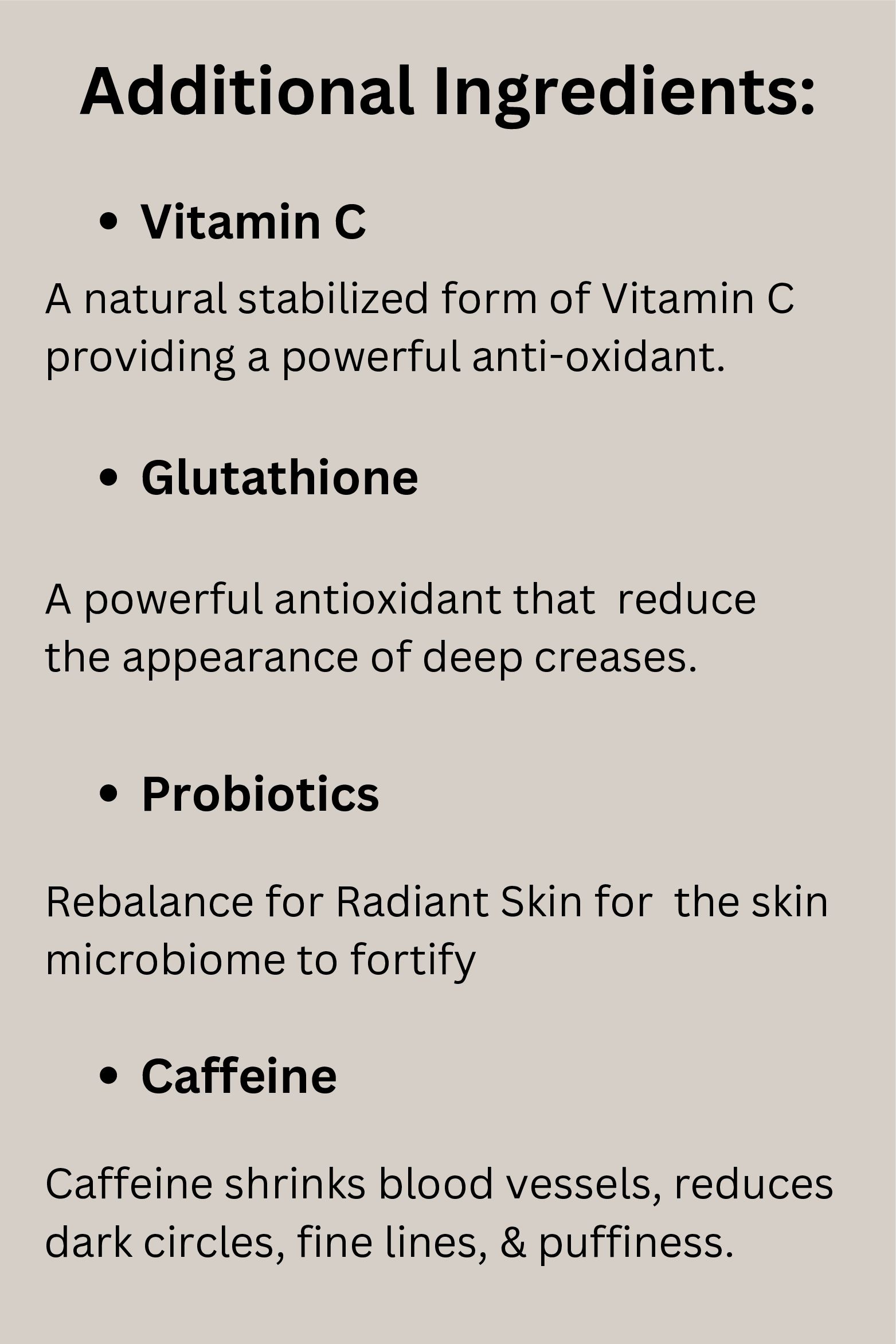 form of Vitamin C providing a powerful anti-oxidant. A powerful antioxidant that reduce the appearance of deep creases. Rebalance for Radiant Skin for the skin microbiome to fortify Caffeine shrinks blood vessels, reduces dark circles, fine lines, & puffiness.