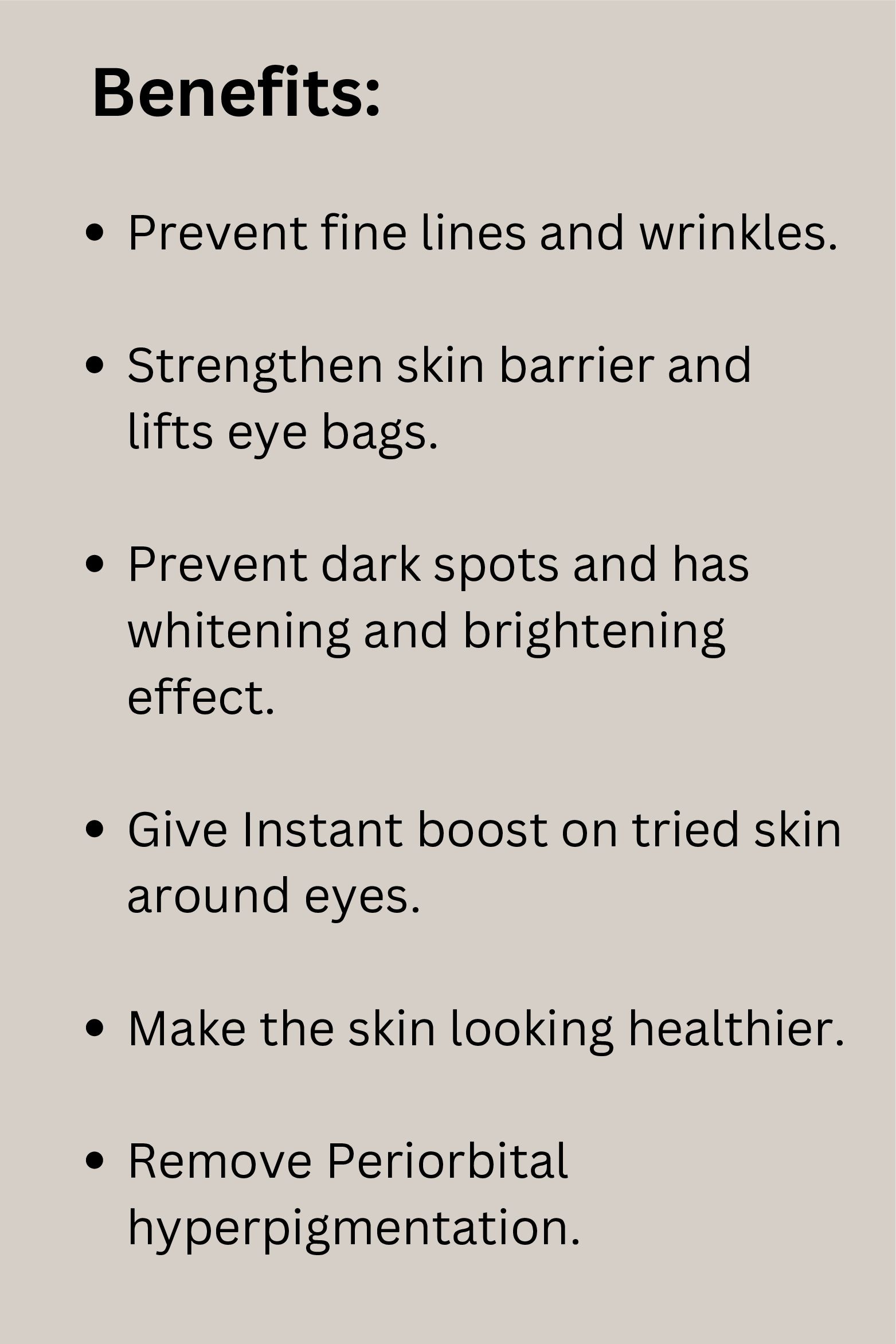 eye bags. Prevent dark spots and has whitening and brightening effect. Give Instant boost on tried skin around eyes. Make the skin looking healthier. Remove Periorbital hyperpigmentation. Benefits: