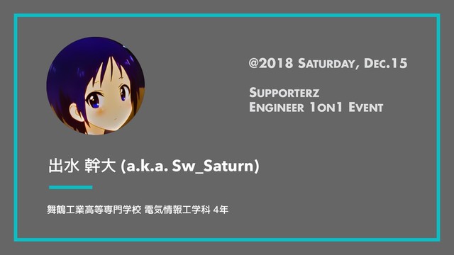 でSwiftを学習 Python Linuxで,常時動く システムを制作する ために学習し始める LAMP 高専プロコンの制作 で,LAMP(Linux・ Apache・MySQL・ PHP)環境を構築 Git 学校でGit-itを使用 した講習会があっ たことからGitを使 用し始める Android+ Firebase 高専プロコンの制作 で使用.クラウドの 手軽さを実感した Works 2015 (ߴઐ1年) 2016 (ߴઐ2年) 2017 (ߴઐ3年) HTML+CSS +HUGO アプリケーションのUI 設計が楽しかったこと から,Webのフロント エンドを学習し始める 2017 (ߴઐ3年) 2017 (ߴઐ3年) 2018 (ߴઐ4年) DataBase Backend Application VCS Backend App+Cloud Frontend