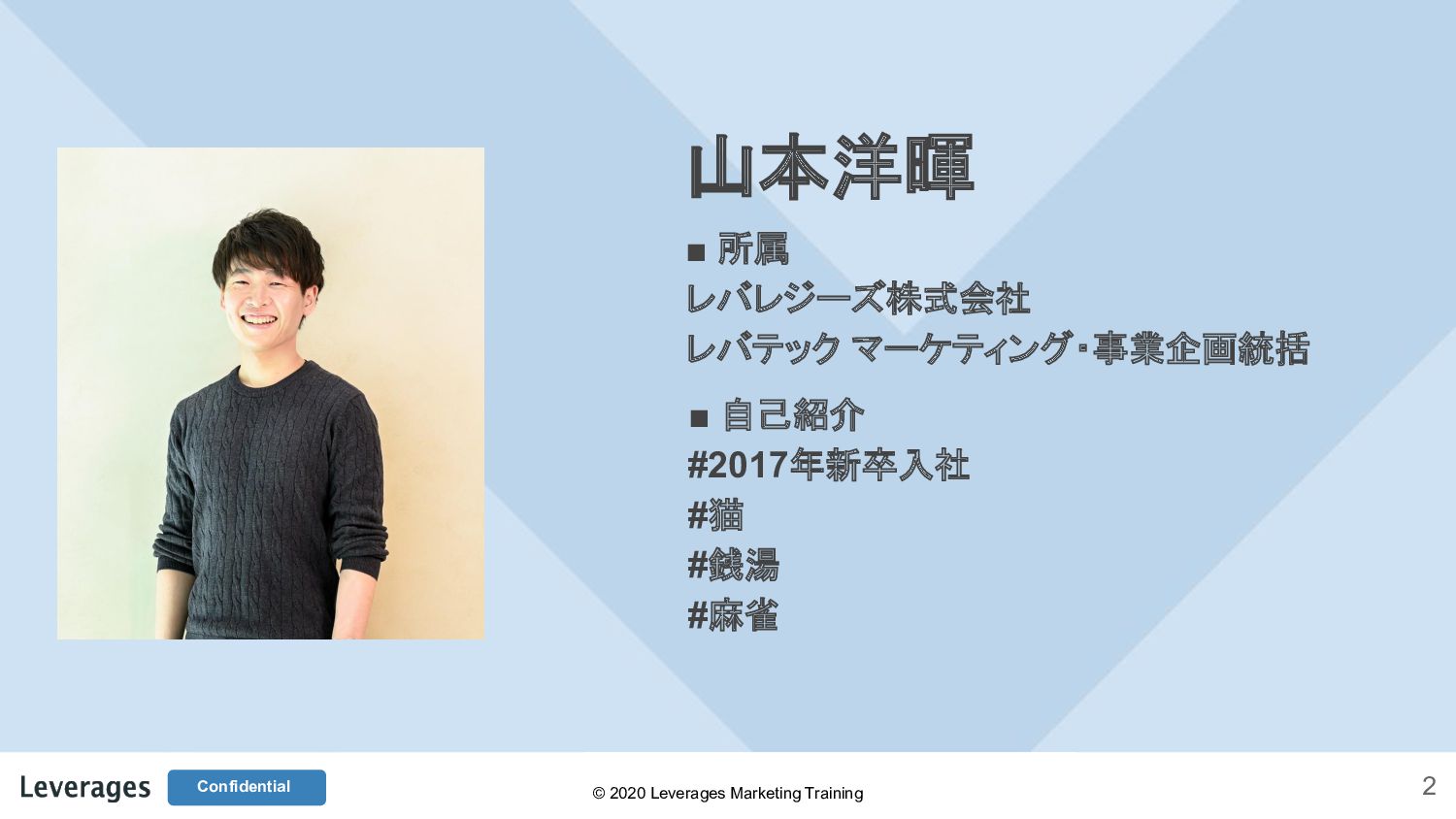 Training 山本洋暉 ▪ 所属 レバレジーズ株式会社 レバテック マーケティング・事業企画統括 ▪ 自己紹介 #2017年新卒入社 #猫 #銭湯 #麻雀 2