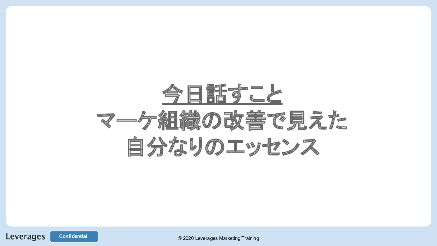 © 2020 Leverages Marketing Training Confidential 今日話すこと マーケ組織の改善で見えた 自分なりのエッセンス