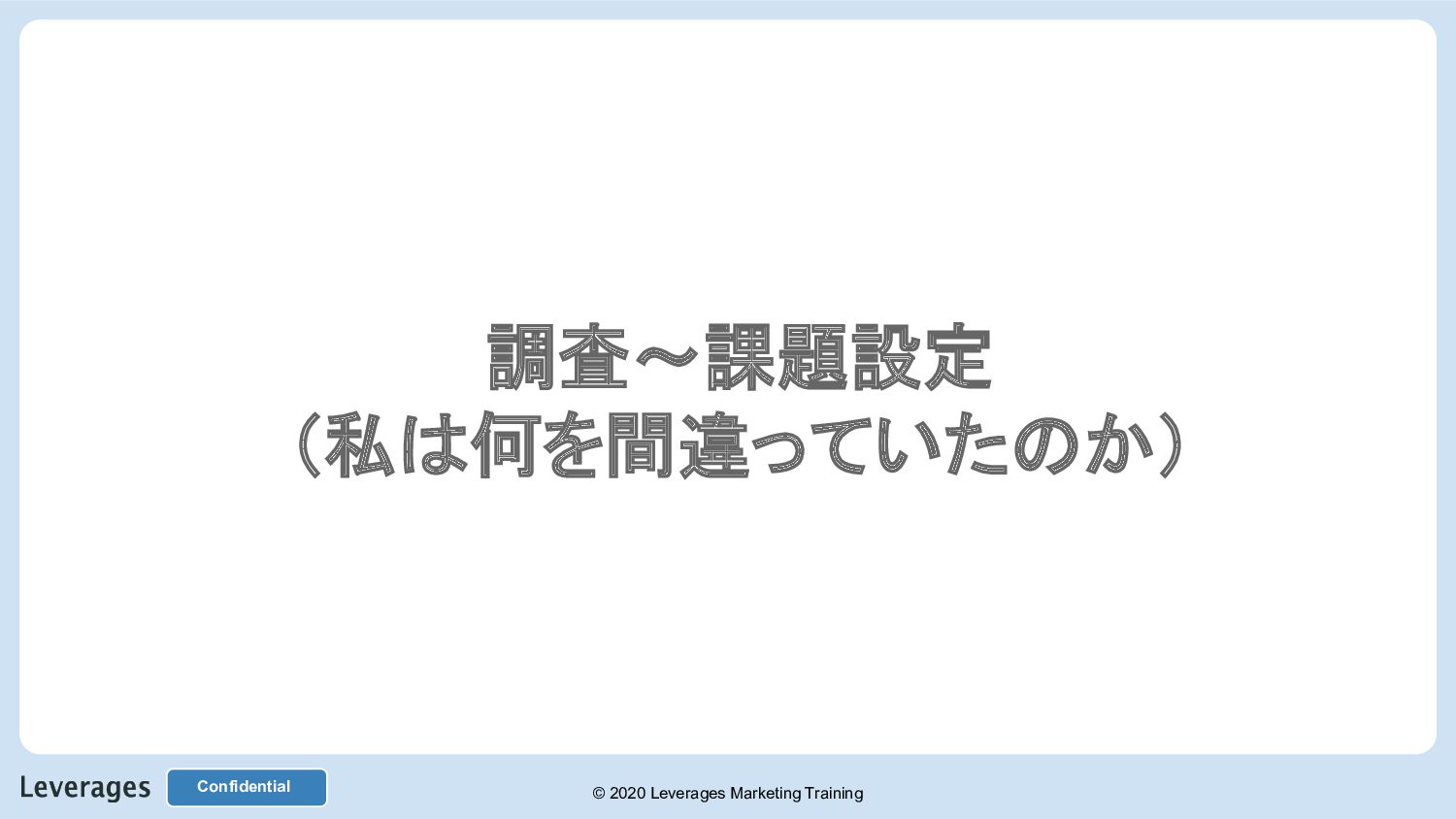 © 2020 Leverages Marketing Training Confidential 調査~課題設定 (私は何を間違っていたのか)