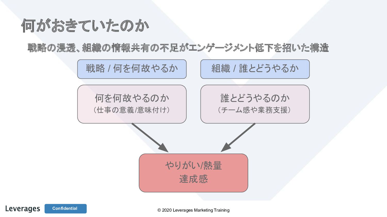 © 2020 Leverages Marketing Training Confidential 何がおきていたのか 何を何故やるのか (仕事の意義/意味付け) 誰とどうやるのか