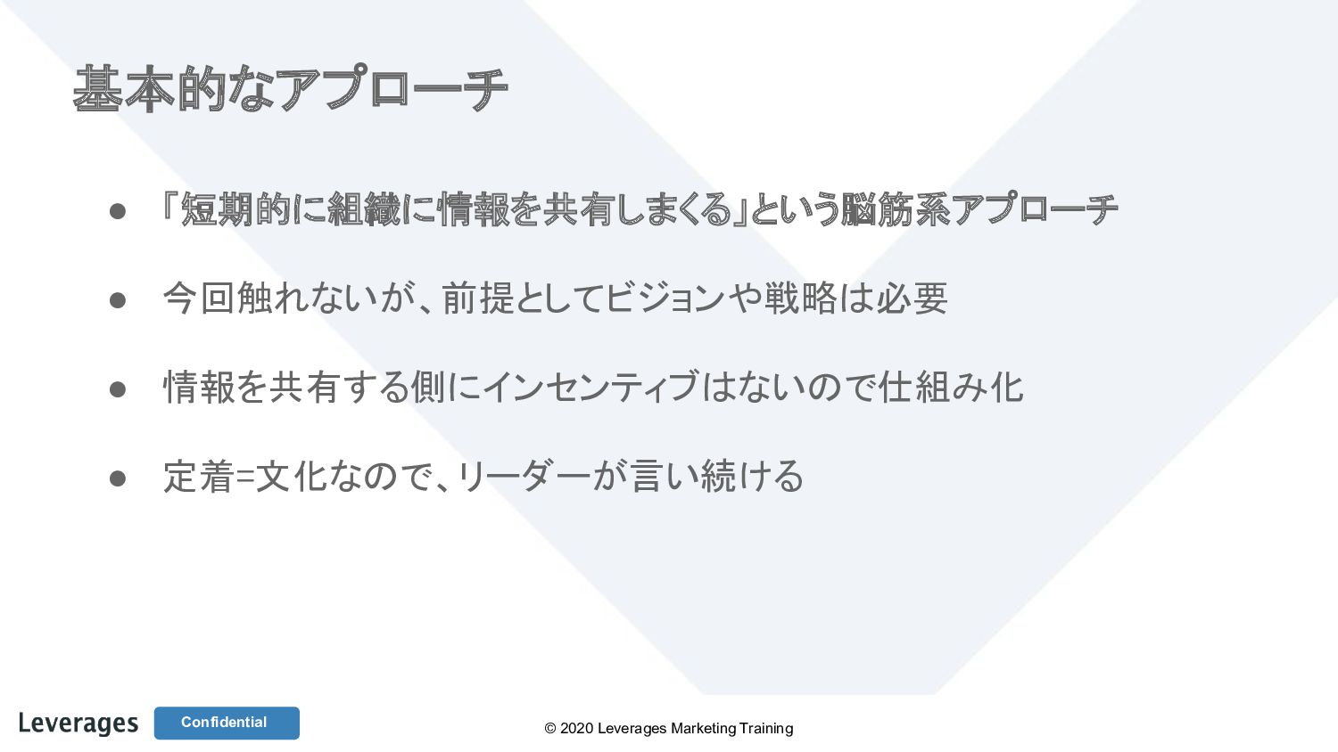 © 2020 Leverages Marketing Training Confidential 基本的なアプローチ • 「短期的に組織に情報を共有しまくる」という脳筋系アプローチ •