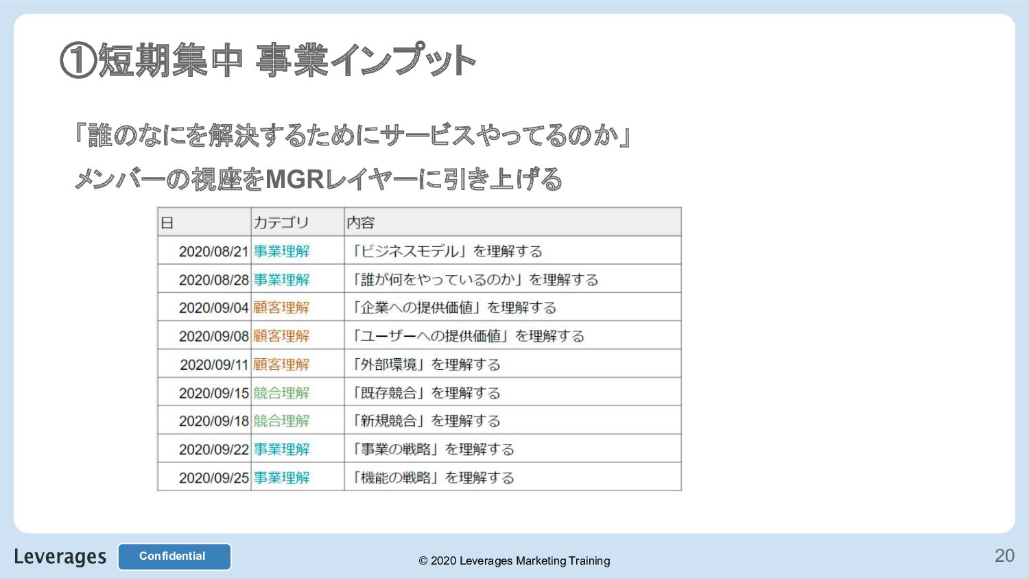 © 2020 Leverages Marketing Training Confidential ①短期集中 事業インプット 「誰のなにを解決するためにサービスやってるのか」 メンバーの視座をMGRレイヤーに引き上げる