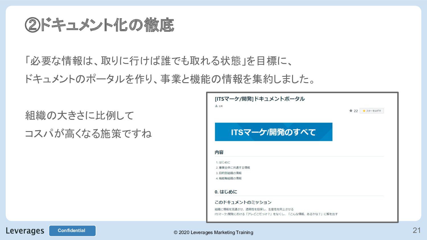 © 2020 Leverages Marketing Training Confidential ②ドキュメント化の徹底 「必要な情報は、取りに行けば誰でも取れる状態」を目標に、 ドキュメントのポータルを作り、事業と機能の情報を集約しました。 組織の大きさに比例して