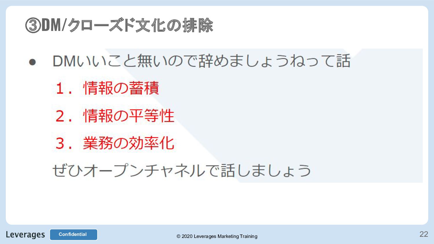© 2020 Leverages Marketing Training Confidential ③DM/クローズド文化の排除 22