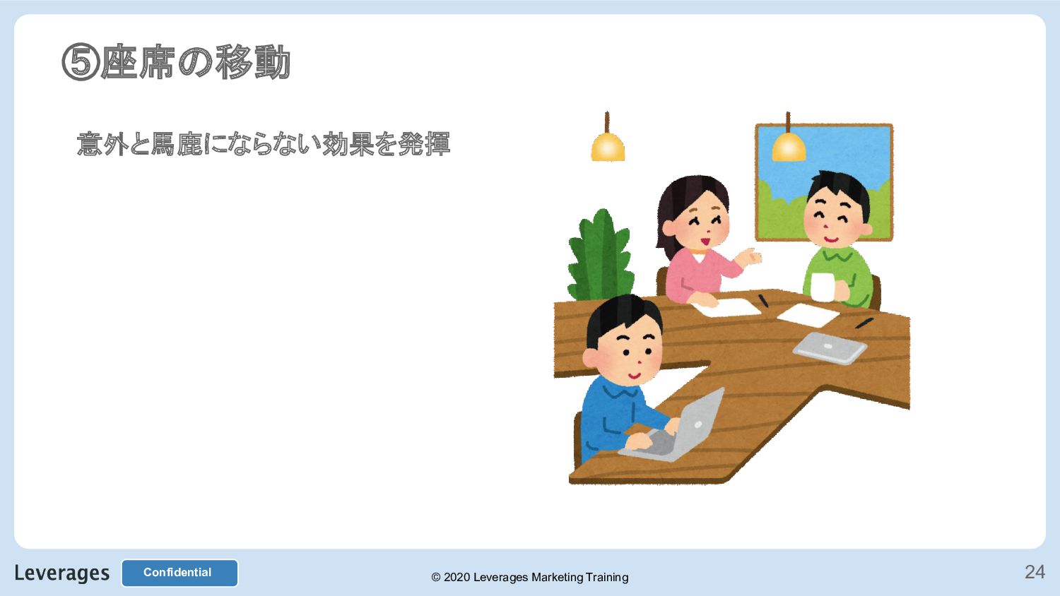 © 2020 Leverages Marketing Training Confidential ⑤座席の移動 意外と馬鹿にならない効果を発揮 24