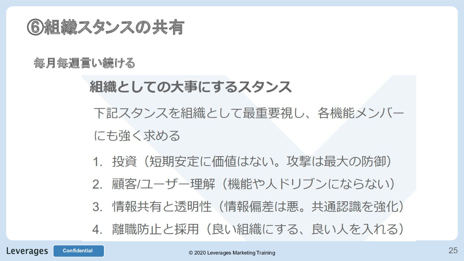 © 2020 Leverages Marketing Training Confidential ⑥組織スタンスの共有 毎月毎週言い続ける 25