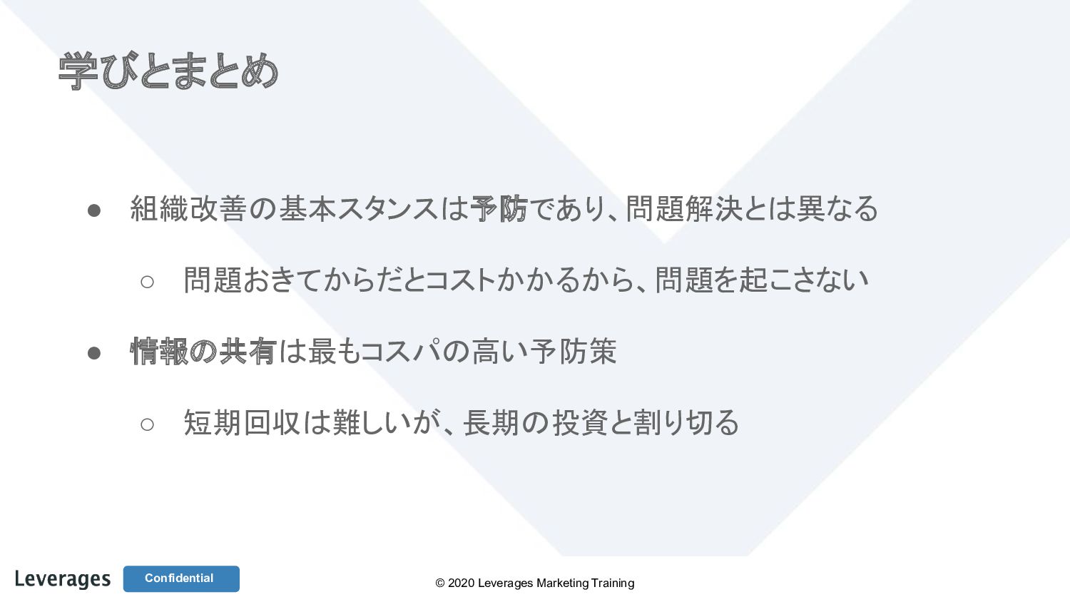 © 2020 Leverages Marketing Training Confidential 学びとまとめ • 組織改善の基本スタンスは予防であり、問題解決とは異なる ◦