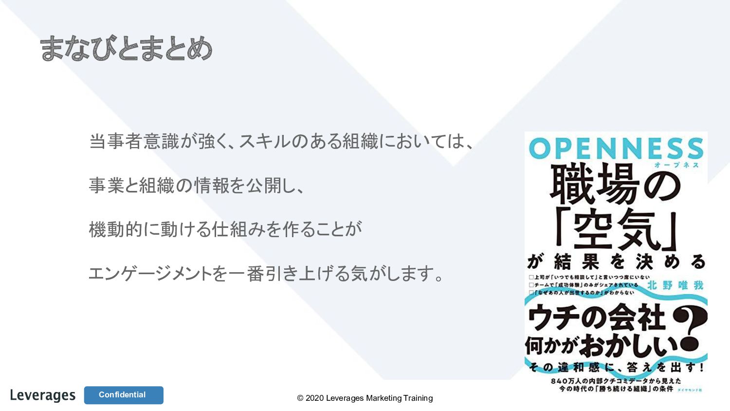 © 2020 Leverages Marketing Training Confidential まなびとまとめ 当事者意識が強く、スキルのある組織においては、 事業と組織の情報を公開し、 機動的に動ける仕組みを作ることが