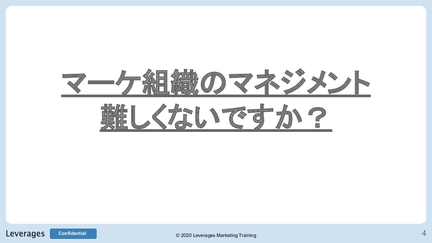 © 2020 Leverages Marketing Training Confidential マーケ組織のマネジメント 難しくないですか? 4
