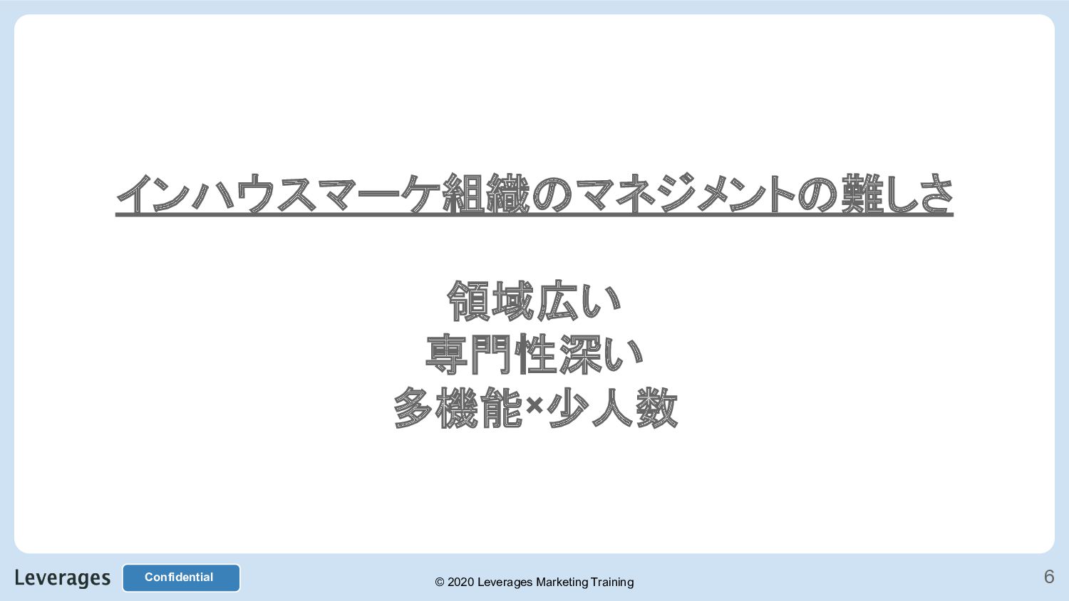 © 2020 Leverages Marketing Training Confidential インハウスマーケ組織のマネジメントの難しさ 領域広い 専門性深い 多機能×少人数