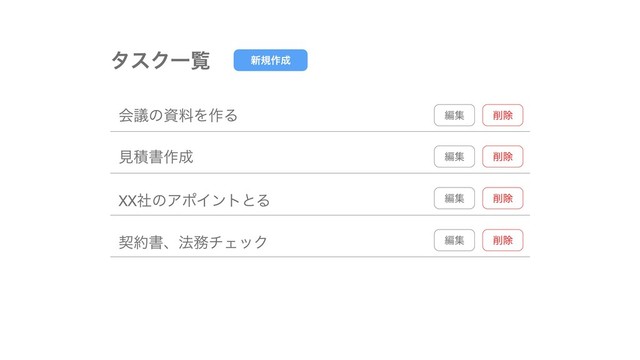 新規作成 タスク一覧 会議の資料を作る 見積書作成 XX 社のアポイントとる 契約書、法務チェック 編集 削除 編集