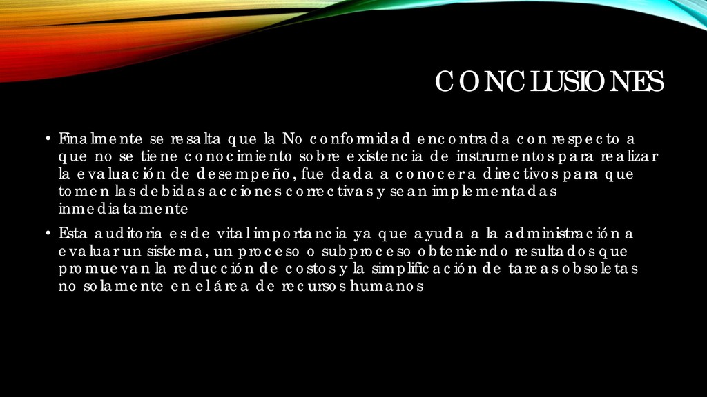 con respecto a que no se tiene conocimiento sobre existencia de instrumentos para realizar la evaluación de desempeño, fue dada a conocer a directivos para que tomen las debidas acciones correctivas y sean implementadas inmediatamente • Esta auditoria es de vital importancia ya que ayuda a la administración a evaluar un sistema, un proceso o subproceso obteniendo resultados que promuevan la reducción de costos y la simplificación de tareas obsoletas no solamente en el área de recursos humanos