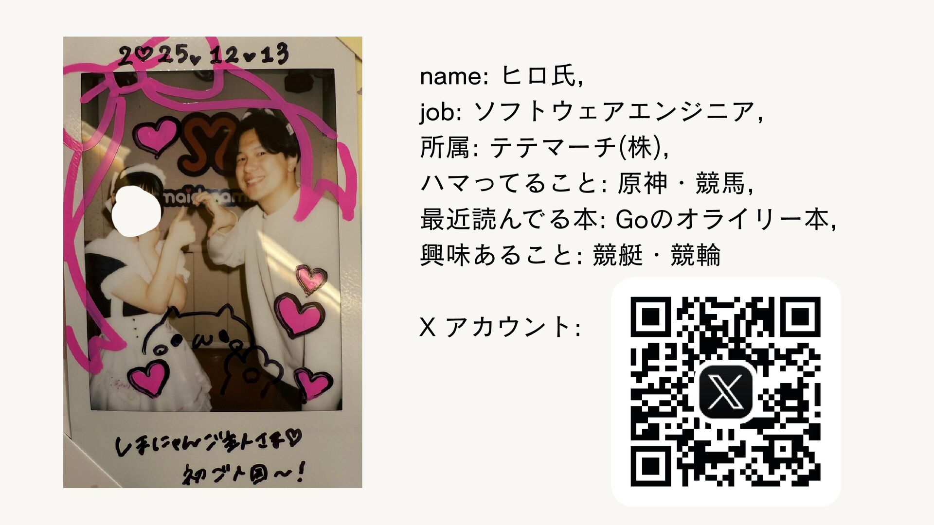 name: ヒロ氏, job: ソフトウェアエンジニア, 所属: テテマーチ(株), ハマってること: 原神・競馬, 最近読んでる本: Goのオライリー本,