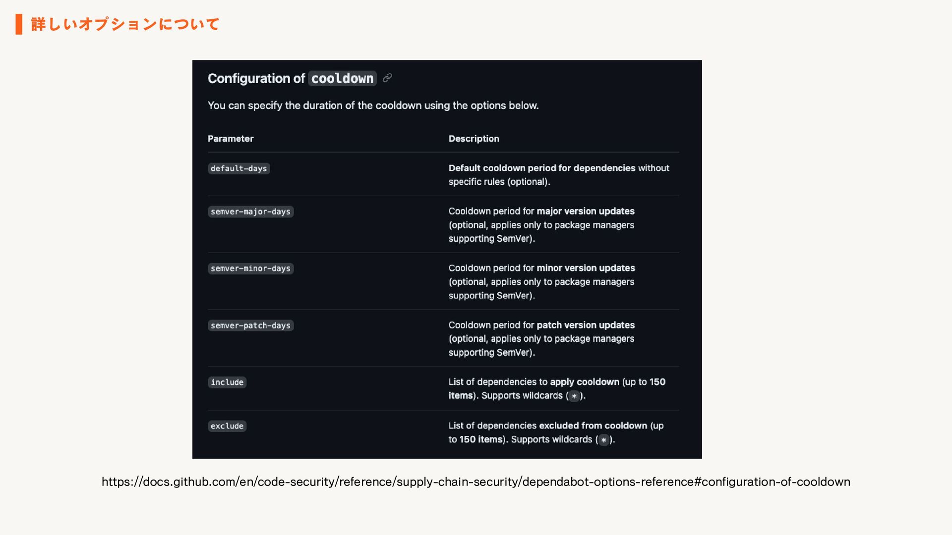 cooldownを使うと何がうれしいのか サードパーティのライブラリには、悪意がなくても新しいバージョ ンに重大な脆弱性があったり、中には意図した悪意のあるコードが 埋め込まれているリスクがあります このような脆弱性が公になる前に不適切なバージョンを取り込 んでしまうことを未然に防げる仕組みがcooldownの設定です そうすることで成熟した・安定したライブラリの利用を保つこ とができます
