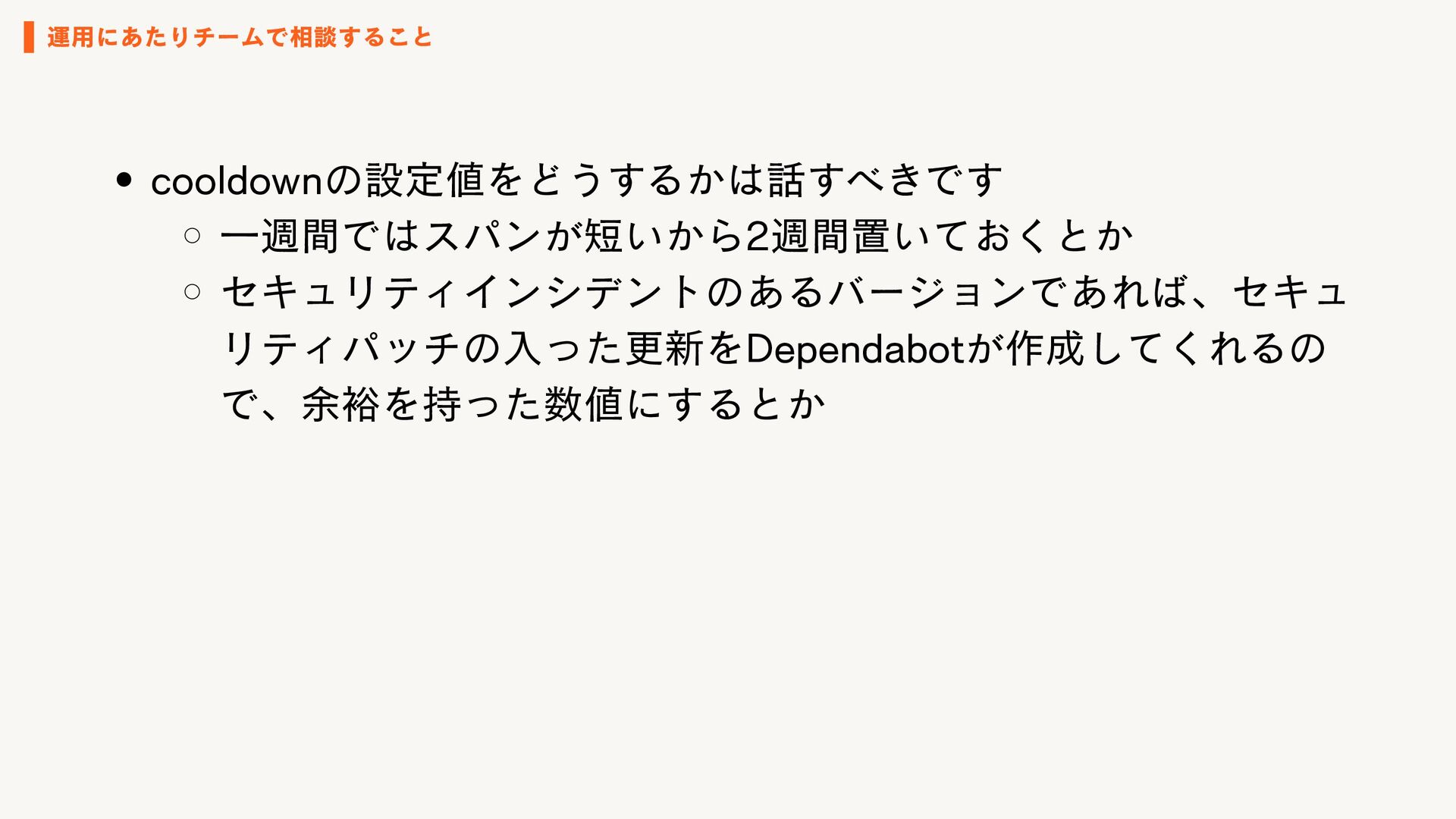 運用にあたりチームで相談すること cooldownの設定値をどうするかは話すべきです 一週間ではスパンが短いから2週間置いておくとか セキュリティインシデントのあるバージョンであれば、セキュ リティパッチの入った更新をDependabotが作成してくれるの で、余裕を持った数値にするとか