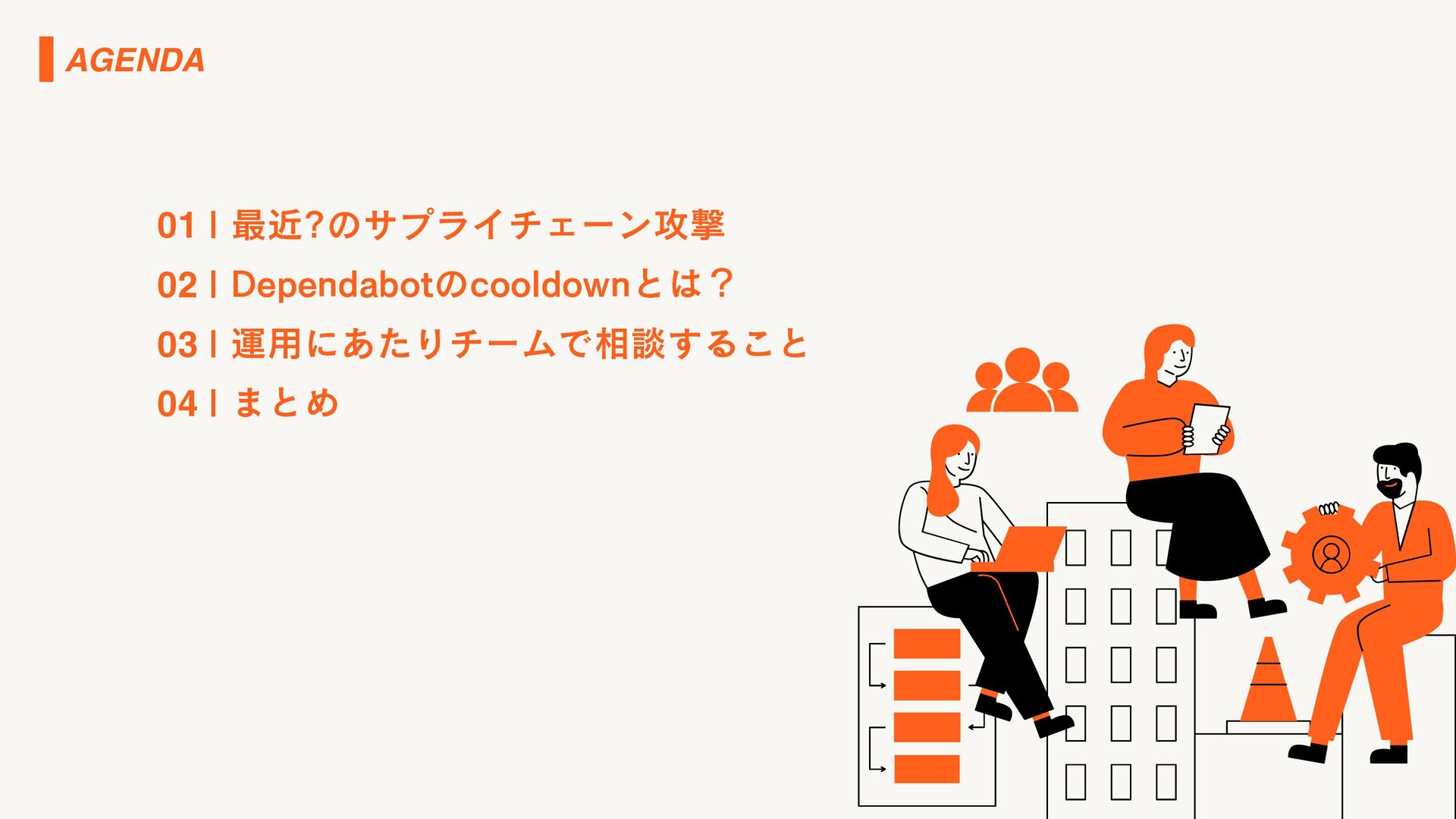 AGENDA 01 | 最近?のサプライチェーン攻撃 02 | Dependabotのcooldownとは? 03 | 運用にあたりチームで相談すること