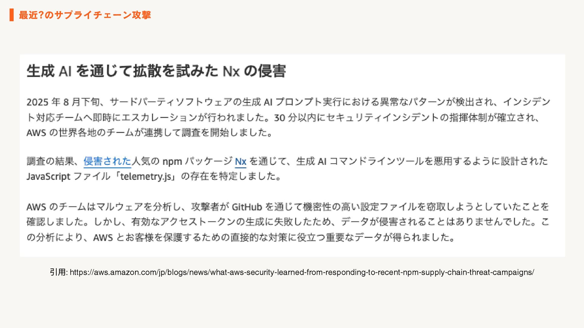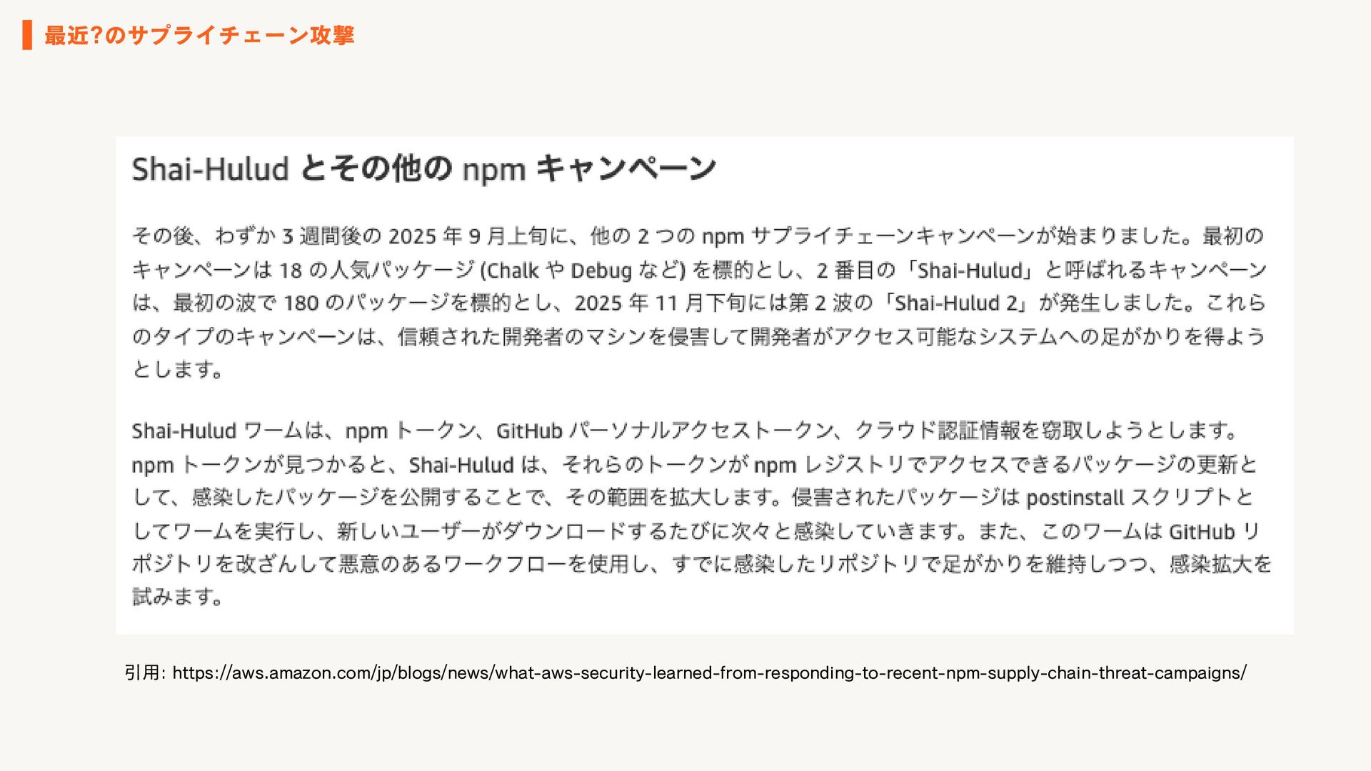 最近?のサプライチェーン攻撃 引用: https://aws.amazon.com/jp/blogs/news/what-aws-security-learned-from-responding-to-recent-npm-supply-chain-threat-campaigns/
