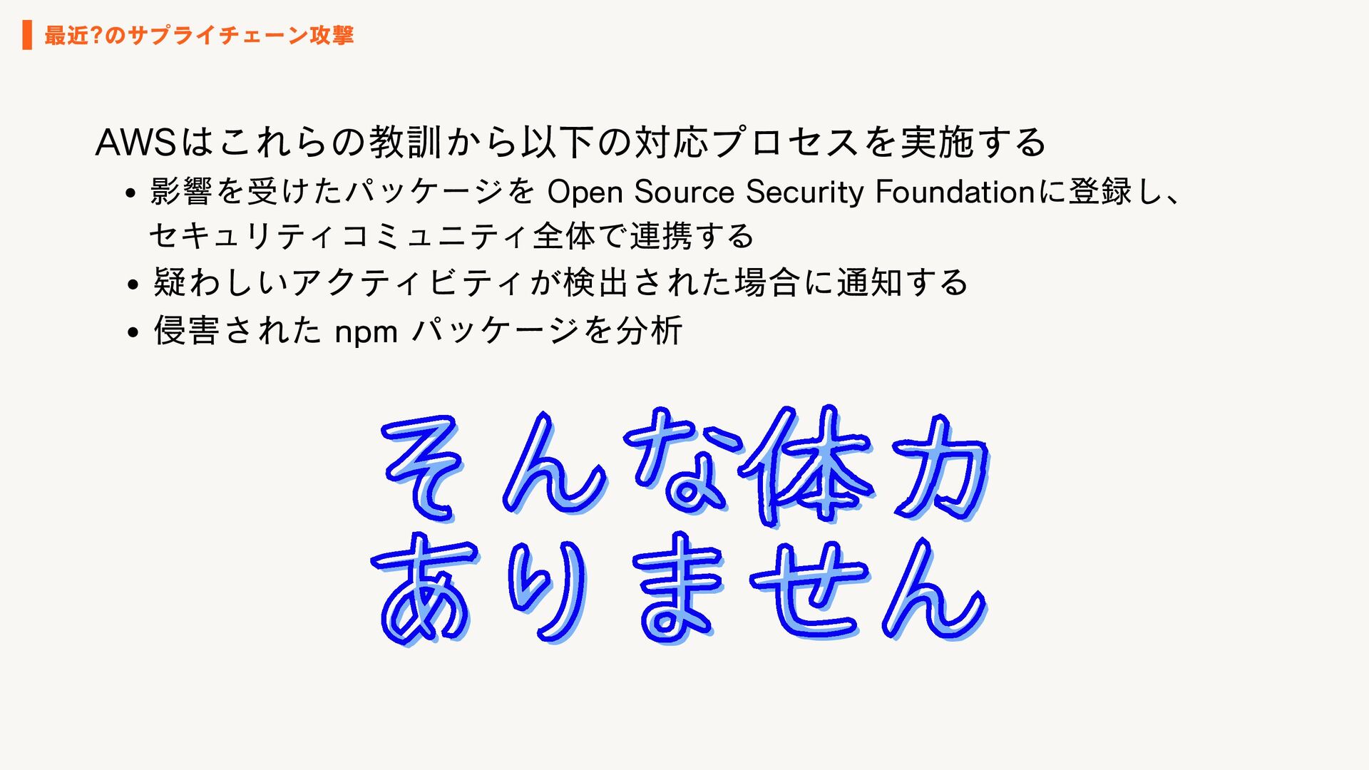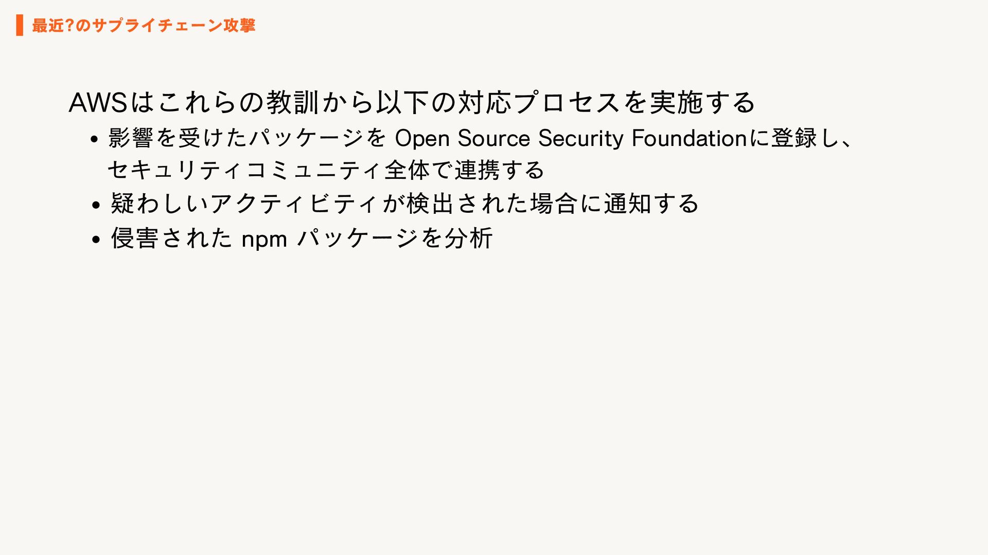 最近?のサプライチェーン攻撃 AWSはこれらの教訓から以下の対応プロセスを実施する 影響を受けたパッケージを Open Source Security Foundationに登録し、 セキュリティコミュニティ全体で連携する 疑わしいアクティビティが検出された場合に通知する