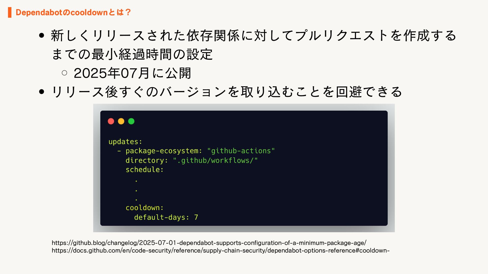 Dependabotのcooldownとは? 新しくリリースされた依存関係に対してプルリクエストを作成する までの最小経過時間の設定 2025年07月に公開 リリース後すぐのバージョンを取り込むことを回避できる https://docs.github.com/en/code-security/reference/supply-chain-security/dependabot-options-reference#cooldown- https://github.blog/changelog/2025-07-01-dependabot-supports-configuration-of-a-minimum-package-age/