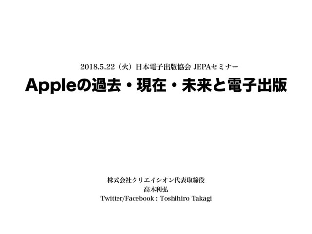 This slide is a lecture by Toshihiro Takagi of Creation Inc. on Tuesday, May 22, 2018 at JEPA seminar titled "Apple's past, present, future and electronic publication".