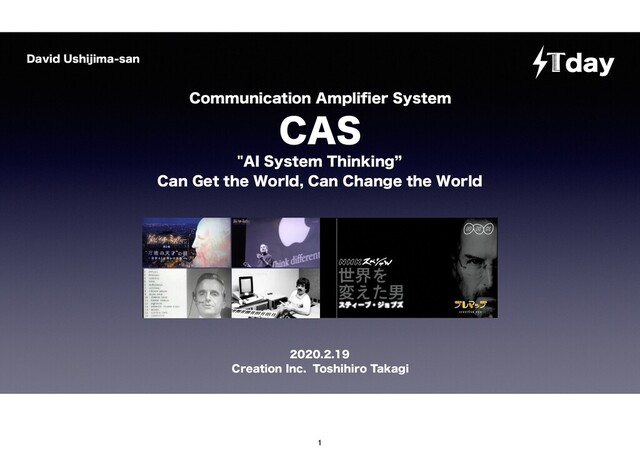 CAS(Communication Amplifier System) is a "AI System Thinking” theory which can get the world, and can change the world. We are now in the IT revolution that fundamentally changes the old social systems, like Capitalism, Socialism, Bureaucracy, Indirect Democracy. We are going from Pyramid Society to Horizontally Distributed Network Society. Now we are working hard just for money, destroying the environment, widening the gap between rich and poor, and going to ruin. If you want to escape from this catastrophic negative spiral, you have to be free from "Money is all" illusion. CAS theory was born inspired by Alan Kay's idea. Alan Kay designed the personal computer as a communication amplifier. The challenge we face is how we can design the future Internet society as best communication amplifier systems.