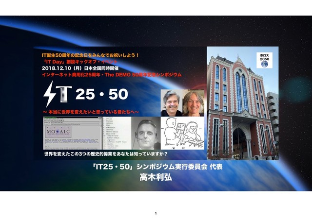 2018年12月10日、「パーソナルコンピュータの父」アラン・ケイ基調講演/インターネット商用化25周年&ダグラス・エンゲルバートThe DEMO 50周年記念「IT25・50」シンポジウムを慶應義塾大学三田キャンパス東館6階G-Labにて開催。アラン・ケイの基調講演に先立ち、「IT25・50」シンポジウム実行委員会代表の高木利弘が、ダグラス・エンゲルバートのThe DEMOの歴史的意義や、アラン・ケイのDynabook Conceptがいかに大きな歴史的影響を与えたか? そして、IT革命の目的は、人間の知性を向上させ、協働してさまざまな問題解決を計るところにあるが、現在の混乱の原因がITリテラシー教育の遅れにあることなどを解説した。