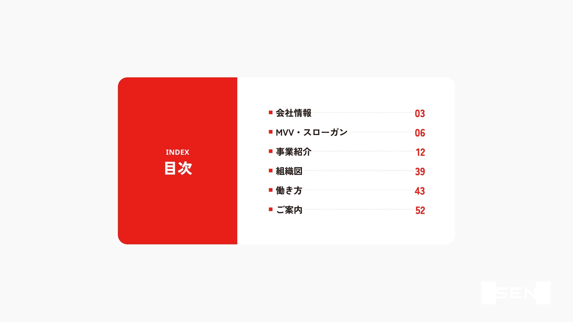 Index 目次 会社情報 03 MVV・スローガン 06 事業紹介 12 組織図 39